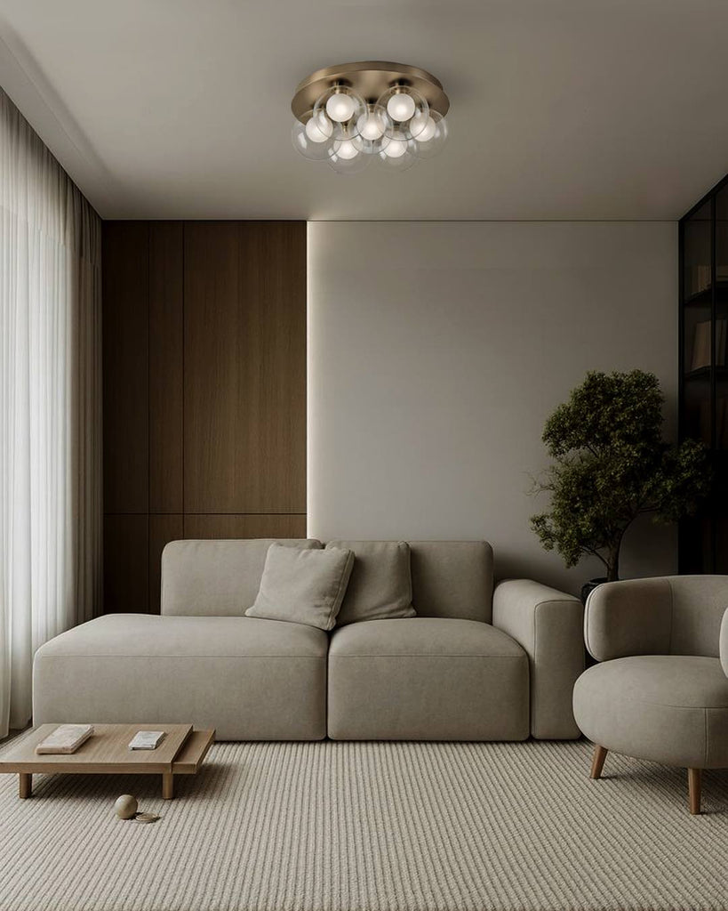 The Nulu flush-mount lamp offers a refined expression of modern elegance, featuring a sculptural cluster of clear glass globes set beneath a smooth, brass base. Its low-profile design delivers generous illumination while maintaining a clean, unobtrusive presence, making it ideal for bedrooms, hallways, and contemporary living spaces with lower ceilings. Each globe diffuses light with exceptional clarity, creating a soft yet radiant ambient glow. Meticulously crafted with attention to detail, the Nulu flush-mount brings a luxurious, architectural touch to interiors while ensuring both functionality and timeless visual appeal.