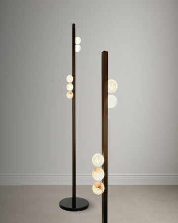 The Cyrian floor lamp combines the natural beauty of Alabaster stone with the sleek sophistication of metal craftsmanship. Each luminous sphere reveals unique stone veining, creating a warm, celestial glow that transforms any interior into a serene sanctuary. Its slender linear frame stands with quiet strength, balancing minimalism and artistry in perfect harmony. Ideal for living rooms, lobbies, or reading corners, the Cyrian invites an ambient radiance that feels both modern and timeless.