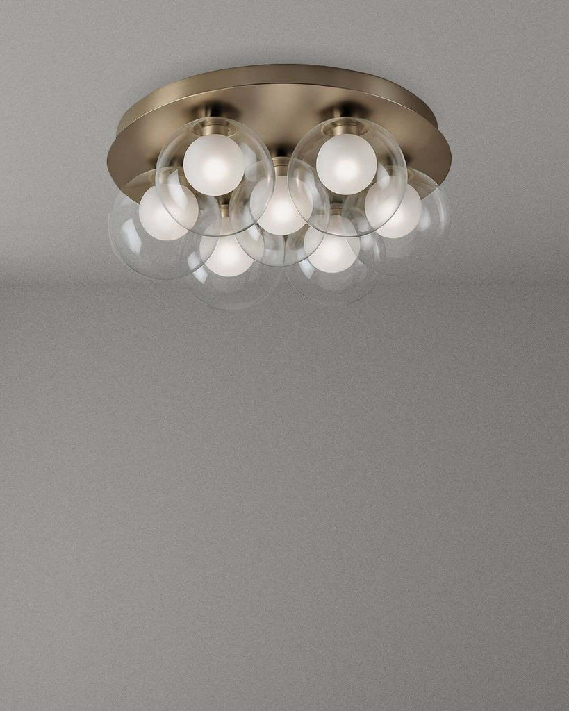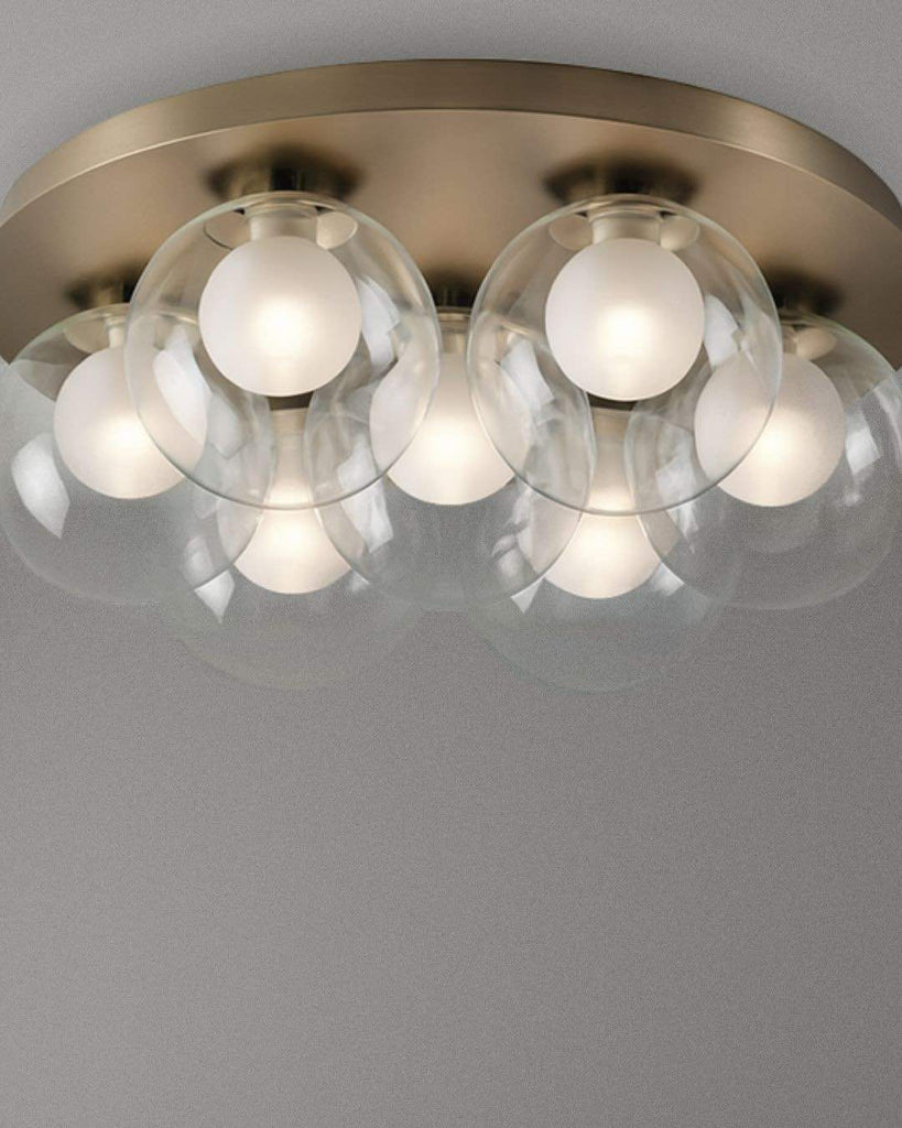 The Nulu flush-mount lamp offers a refined expression of modern elegance, featuring a sculptural cluster of clear glass globes set beneath a smooth, brass base. Its low-profile design delivers generous illumination while maintaining a clean, unobtrusive presence, making it ideal for bedrooms, hallways, and contemporary living spaces with lower ceilings. Each globe diffuses light with exceptional clarity, creating a soft yet radiant ambient glow. Meticulously crafted with attention to detail, the Nulu flush-mount brings a luxurious, architectural touch to interiors while ensuring both functionality and timeless visual appeal.