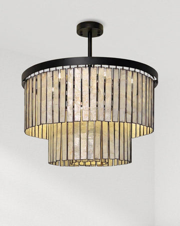 The Solvia ceiling light captures the essence of natural elegance with its layered capiz shell panels delicately framed in sleek metal detailing. Its tiered silhouette softly filters the light, creating a radiant and soothing ambiance that transforms any space into a refined retreat. A perfect harmony of organic texture and modern geometry, Solvia stands out as an artful centerpiece for dining areas, living rooms, and intimate lounge settings.