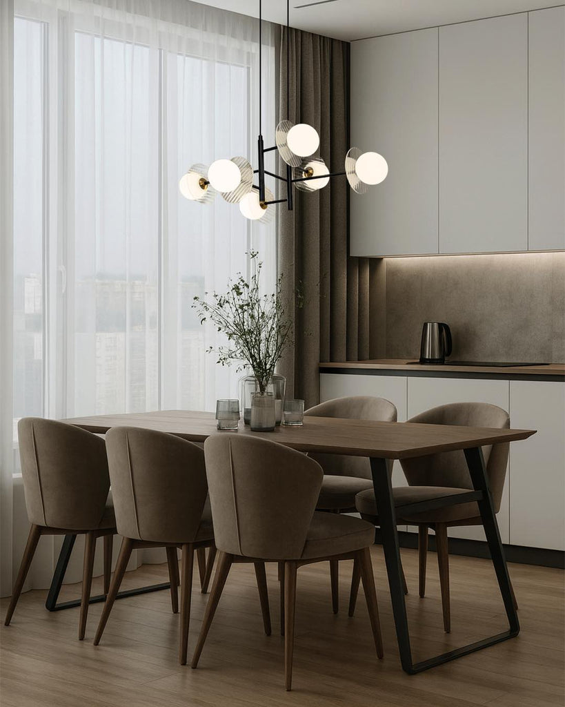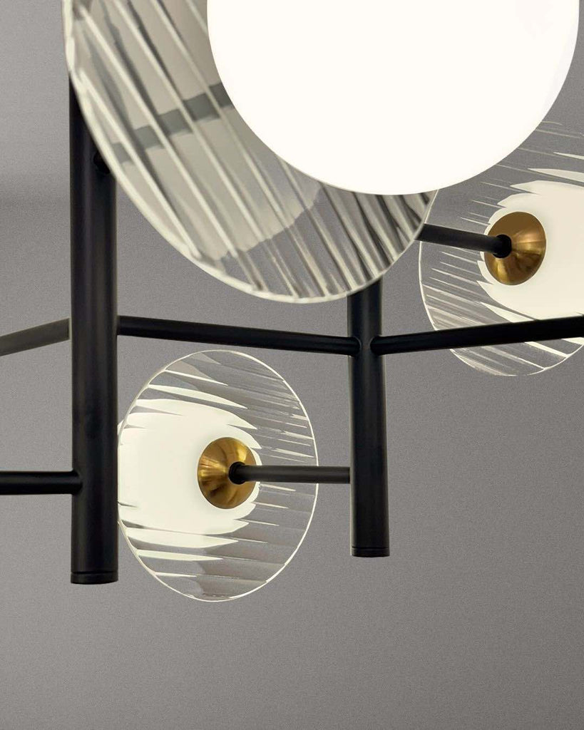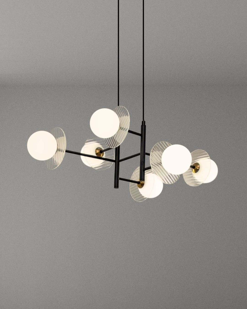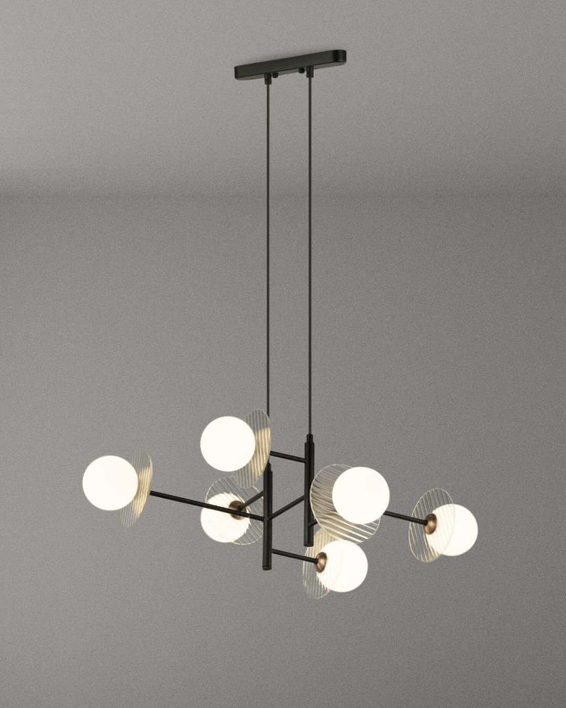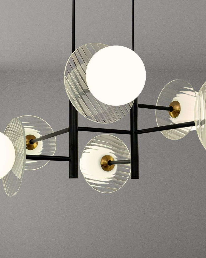 The Avior suspension lamp is a modern statement piece that combines sculptural design with timeless elegance, featuring a sleek black metal frame, warm brass accents, and luminous opal glass globes paired with ribbed glass discs that create a captivating play of light and shadow; perfect for dining rooms, living spaces, or entryways.