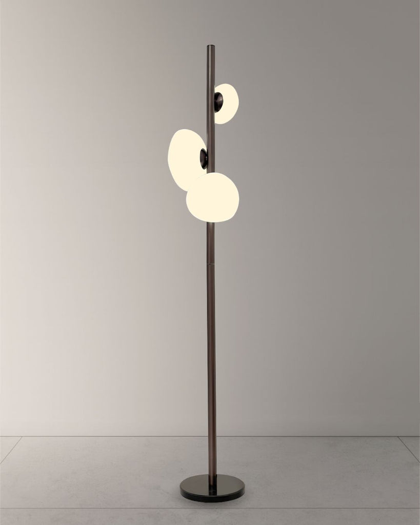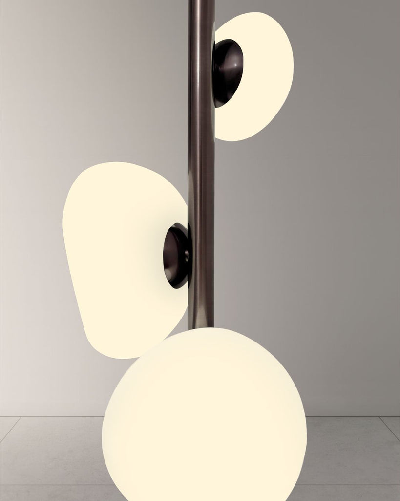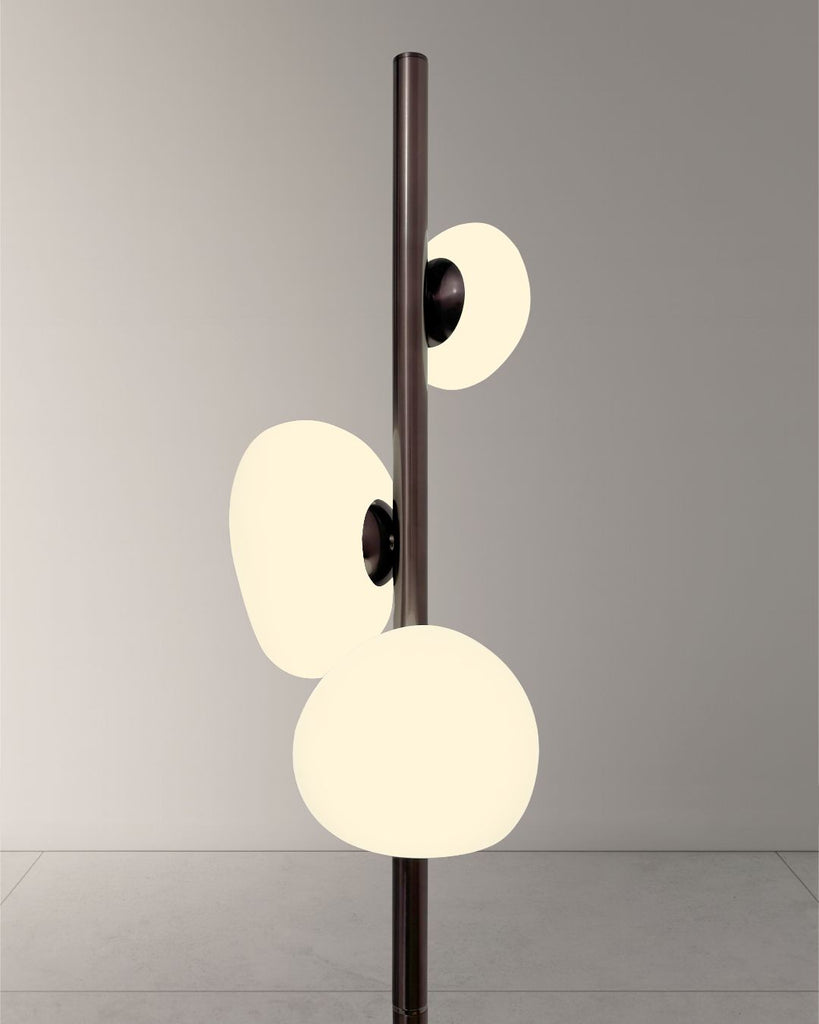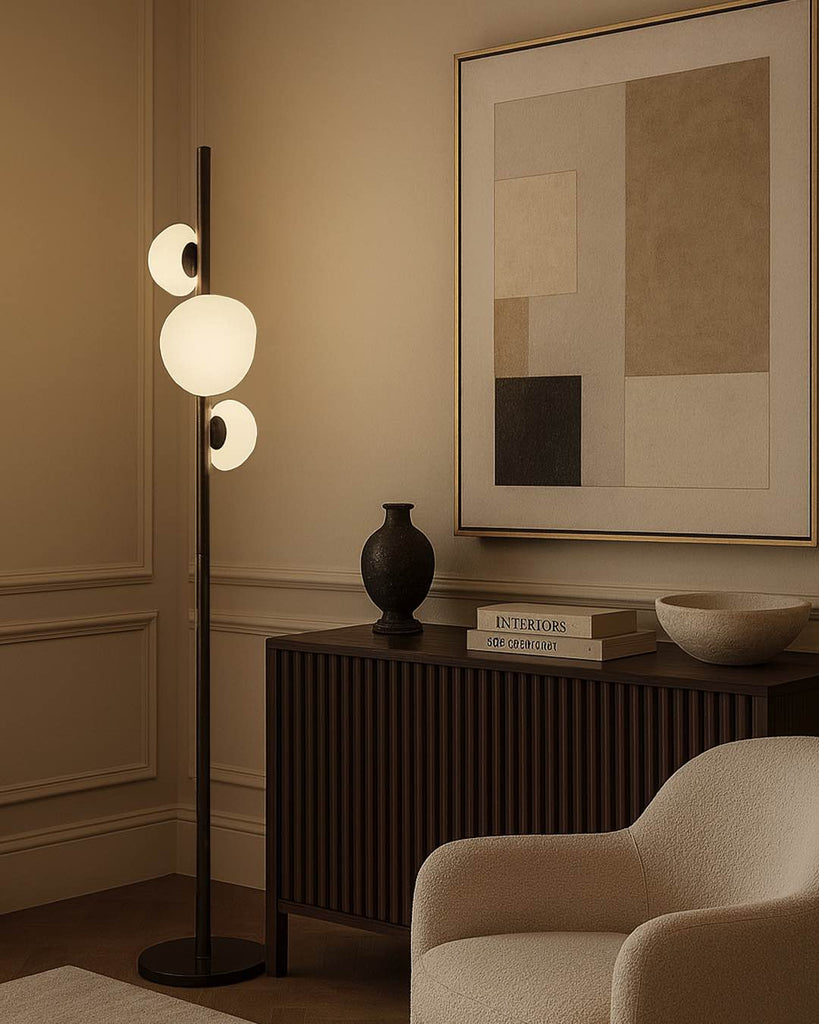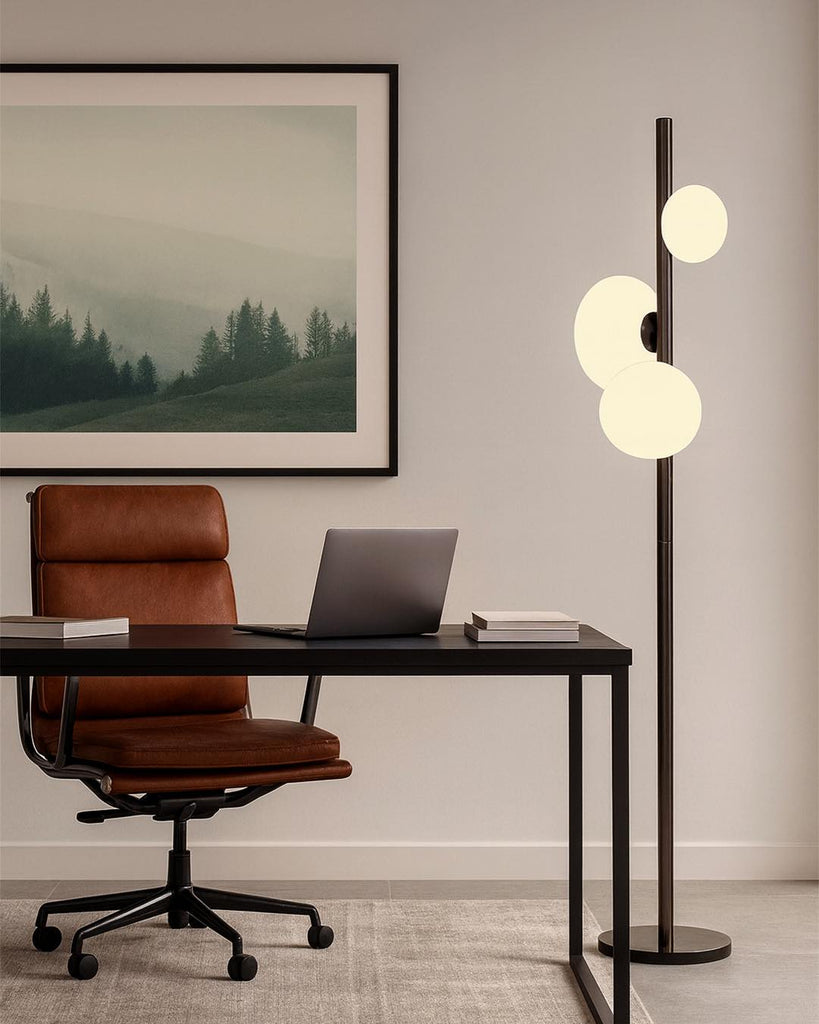 The Brio floor lamp showcases an artistic play of form and light. Featuring asymmetrical glass diffusers mounted along a sleek metal frame, it creates a sculptural presence that doubles as both illumination and décor. Offers warm, energy-efficient lighting while maintaining a clean silhouette. The frosted glass shades diffuse light softly, enhancing the ambiance of living rooms, lounges, or bedrooms.