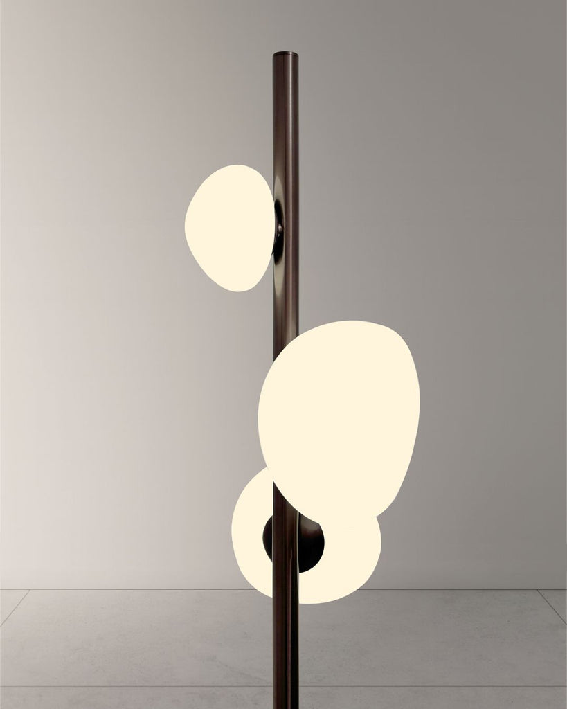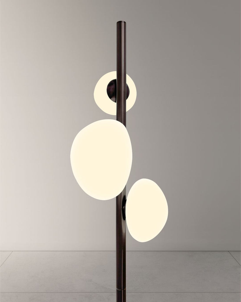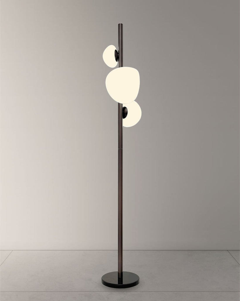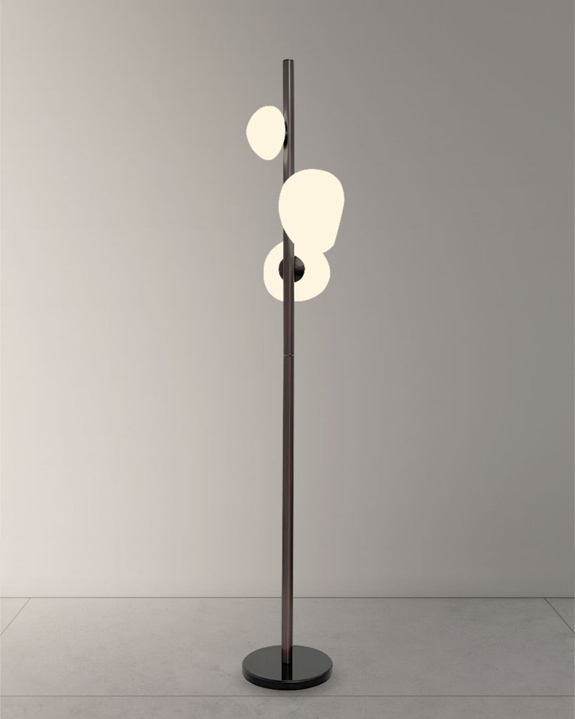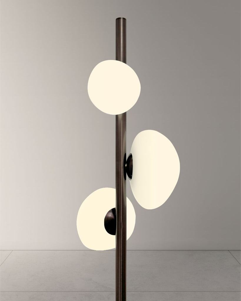 The Brio floor lamp showcases an artistic play of form and light. Featuring asymmetrical glass diffusers mounted along a sleek metal frame, it creates a sculptural presence that doubles as both illumination and décor. Offers warm, energy-efficient lighting while maintaining a clean silhouette. The frosted glass shades diffuse light softly, enhancing the ambiance of living rooms, lounges, or bedrooms.