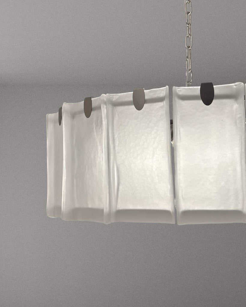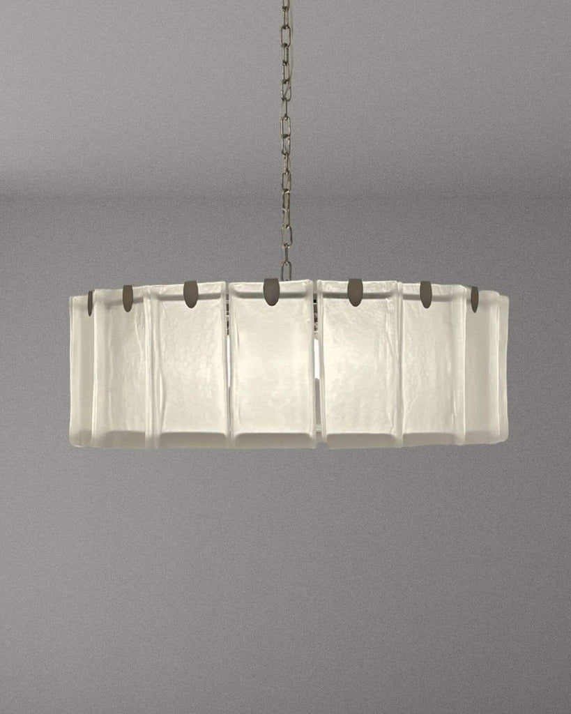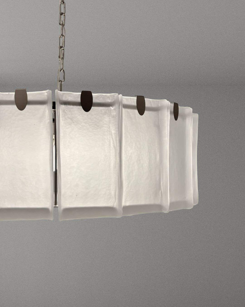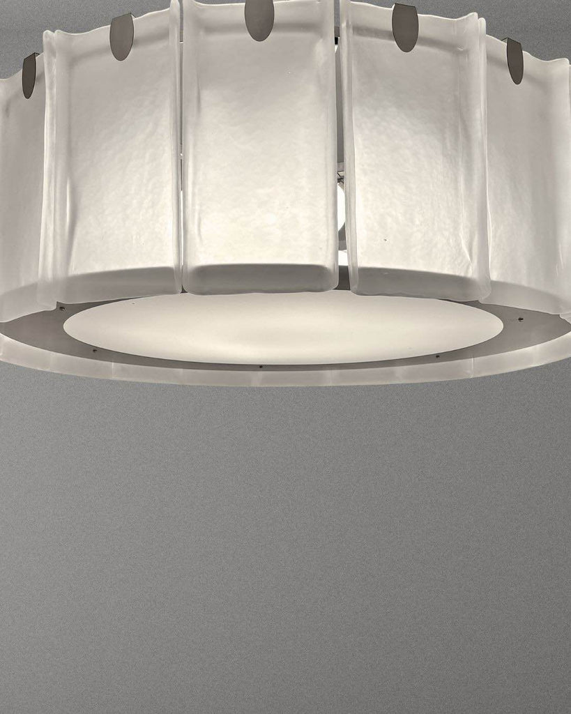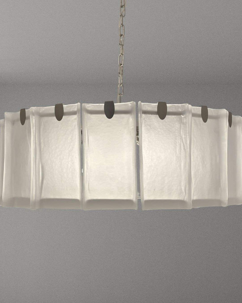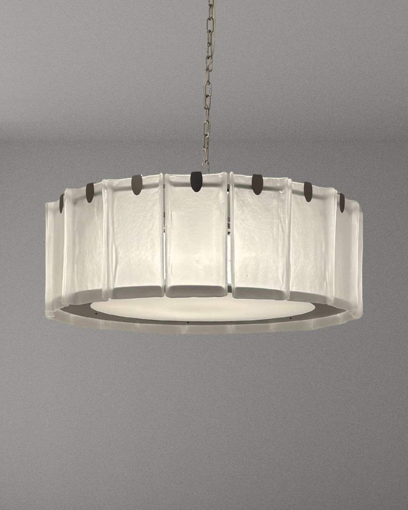 The Calise suspension lamp embodies quiet sophistication through its sculptural form and luminous texture. Crafted with panels of frosted glass delicately framed by a brushed metal structure, Calise diffuses a soft, even glow that enhances any space with understated warmth. Its circular silhouette and subtle chain detail lend balance and refinement, making it a statement piece ideal for dining areas, living rooms, or contemporary hospitality interiors.