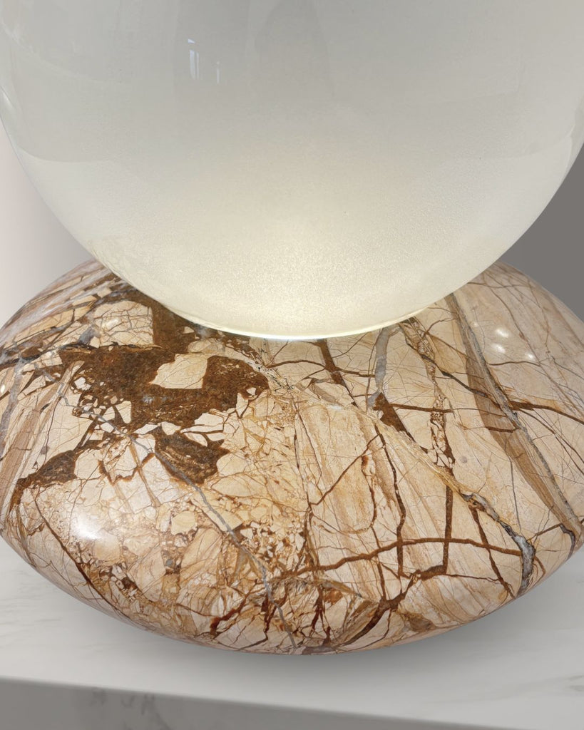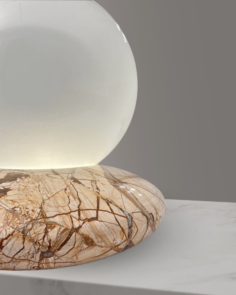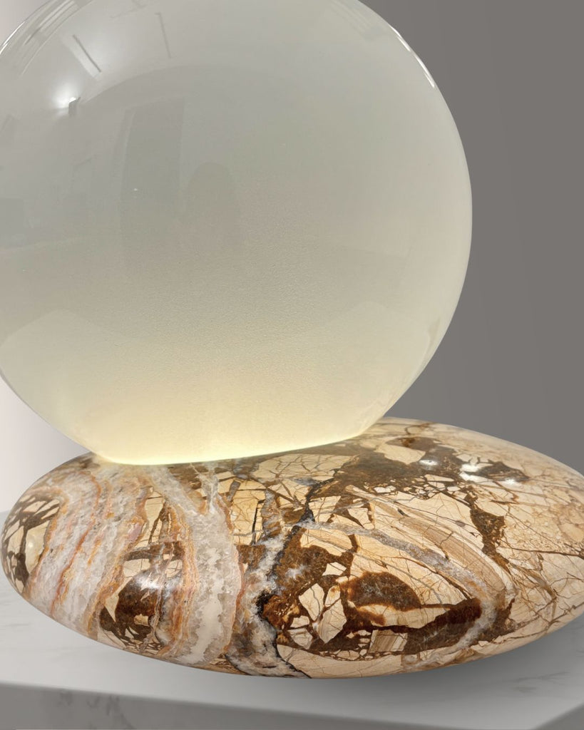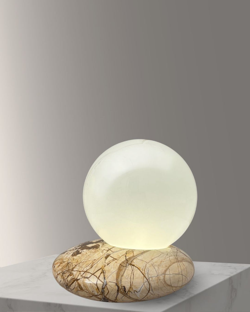 The Cavo Marble table lamp blends natural beauty with modern elegance. A glowing glass globe rests on a beautifully veined marble base, creating a perfect balance of softness and strength. Each piece is unique, showcasing the marble’s natural patterns while giving off a warm, calming light. Chic and timeless, the Cavo adds a touch of effortless sophistication to any space—whether on a bedside table, console, or corner nook.