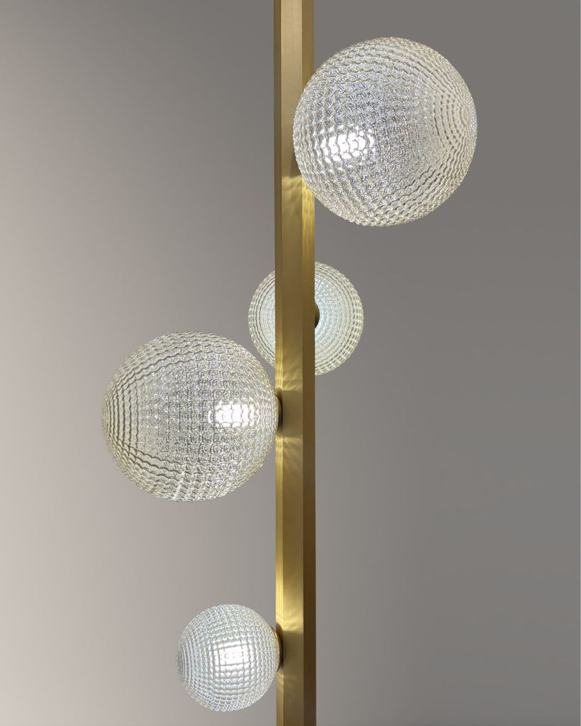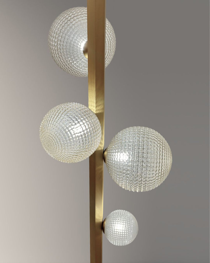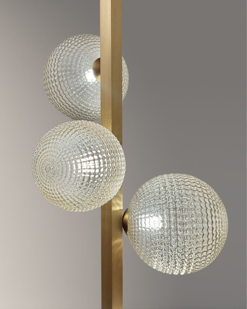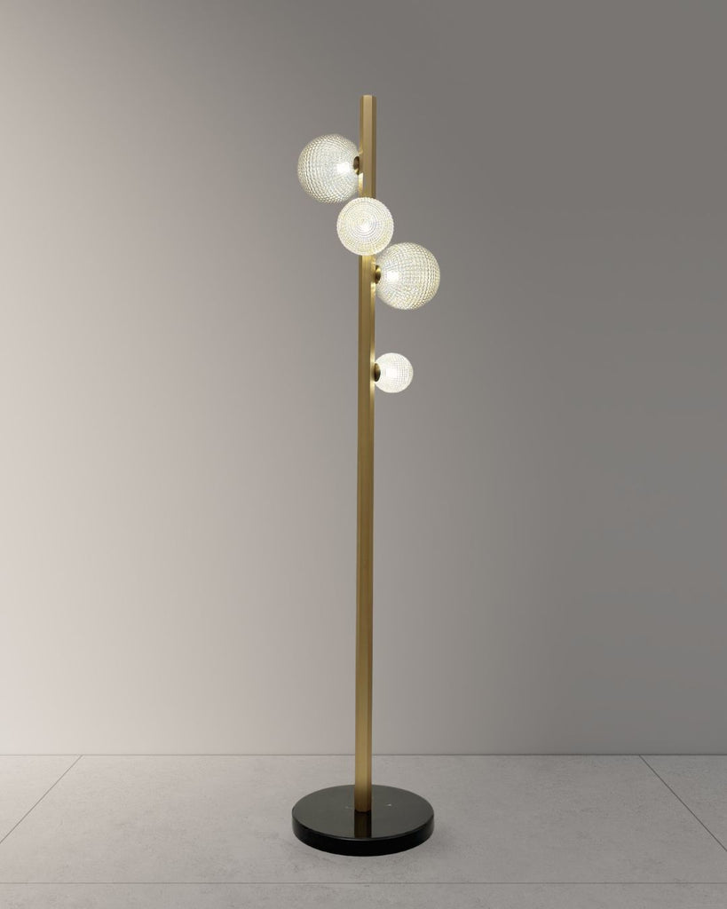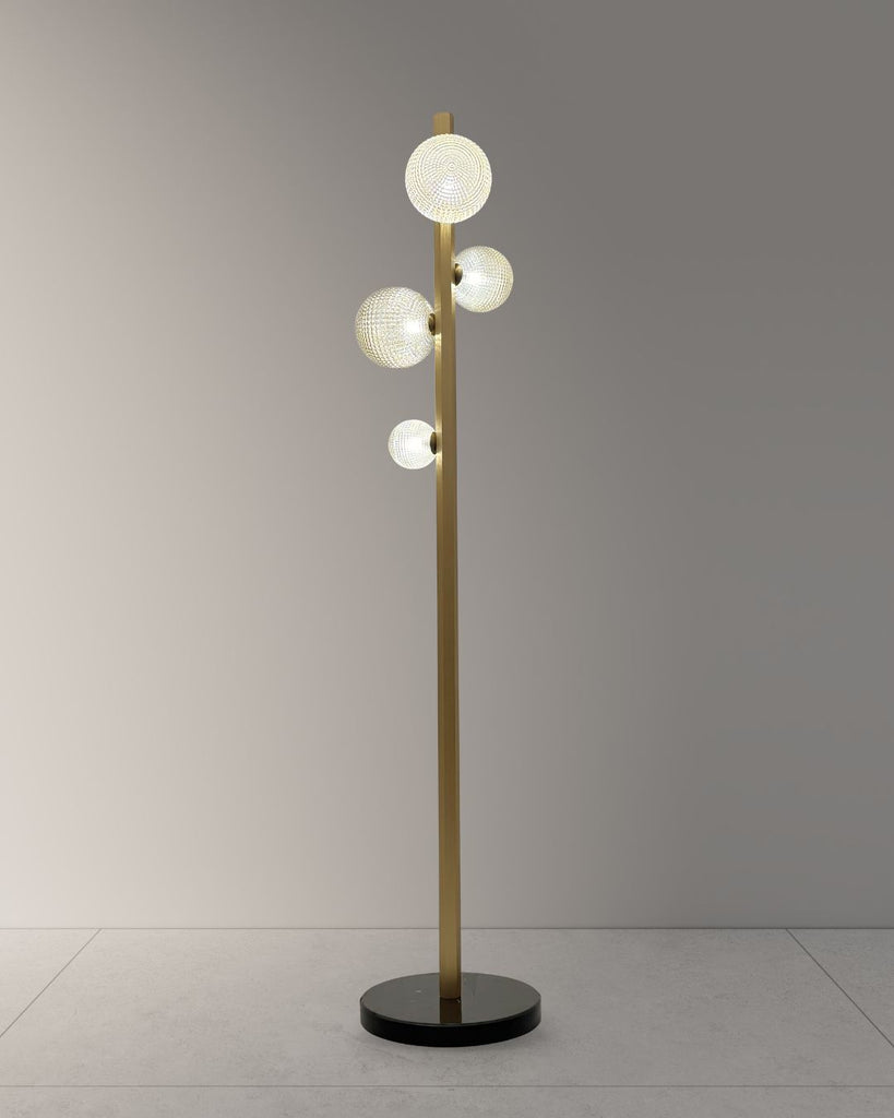 Add a touch of elegance to any room with this sleek floor lamp. Featuring a slim brass stem, black marble base, and five textured glass globes, it delivers soft, ambient light with a sculptural look.