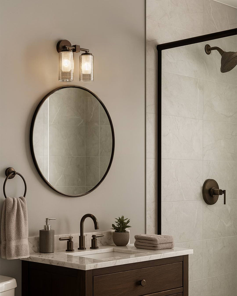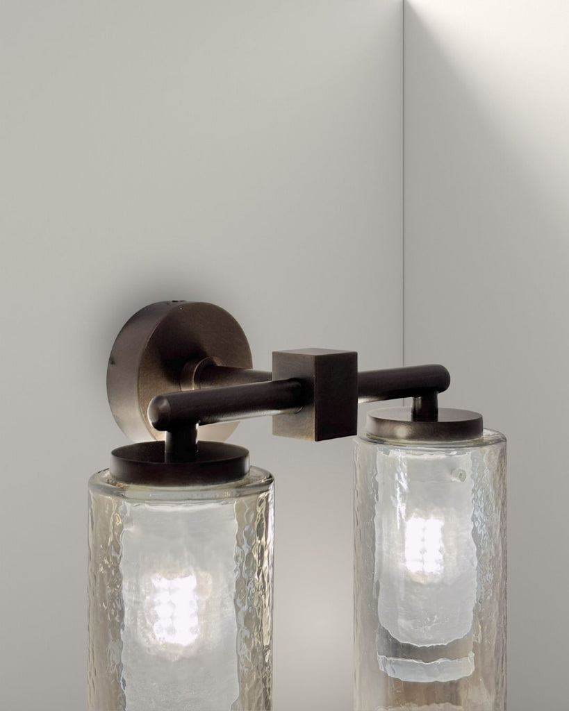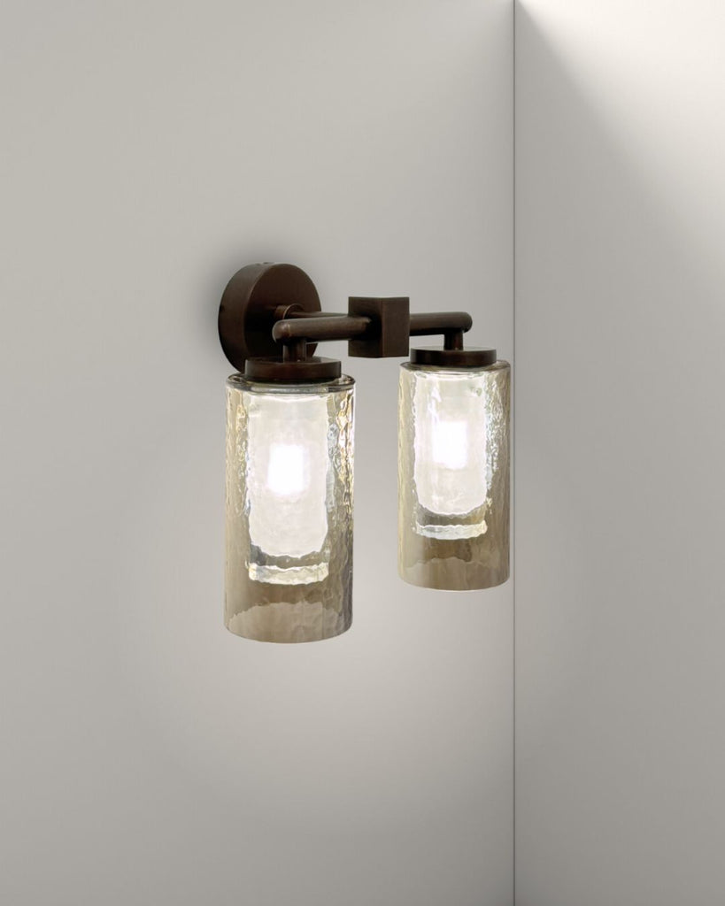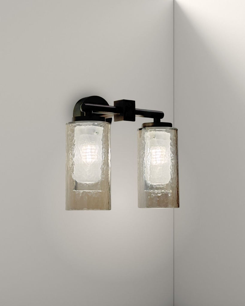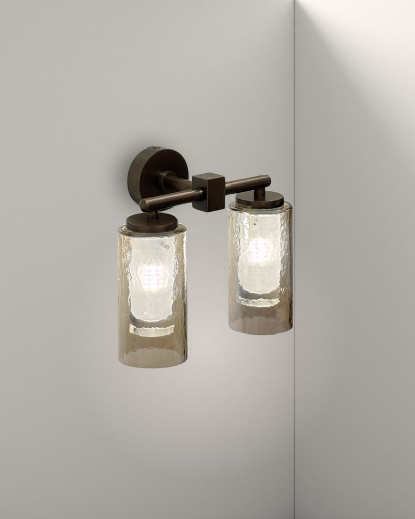 The Keller II Wall Lamp brings a refined blend of modern elegance and artisanal texture to any space. Featuring two smoked glass shades with a subtle hammered finish, it casts a soft, ambient light that enhances warmth and depth in the room. The metal frame adds contrast and sophistication, making it a versatile accent for hallways, bathrooms, or bedside settings.