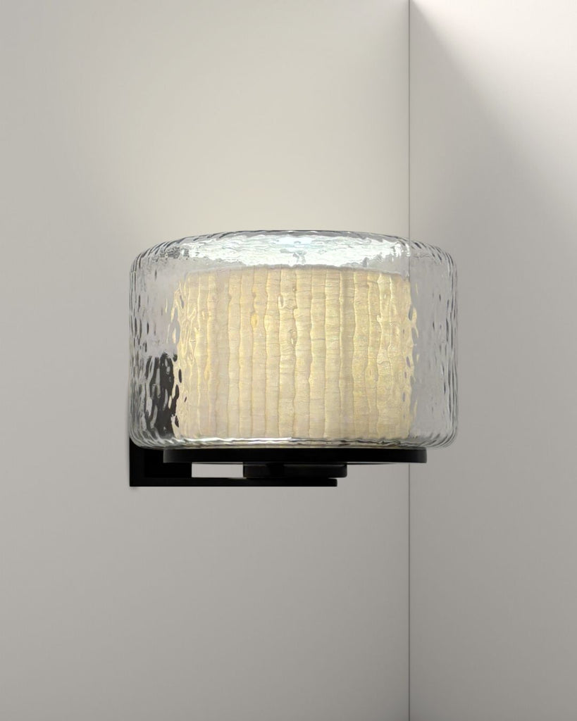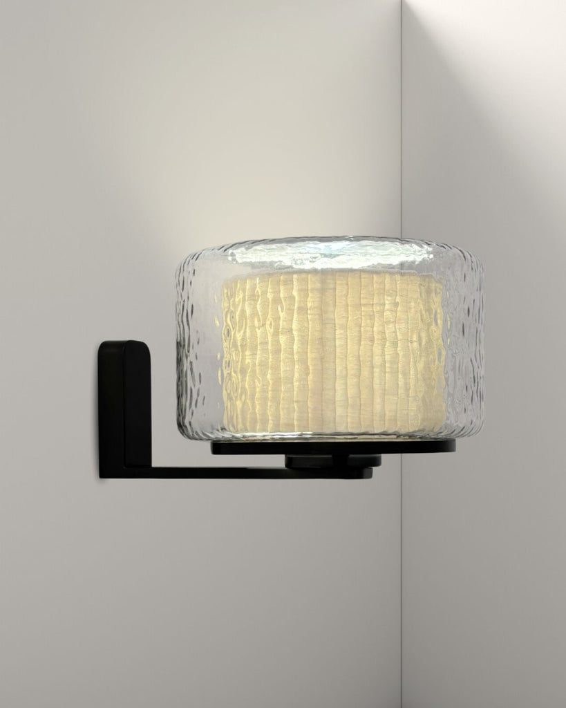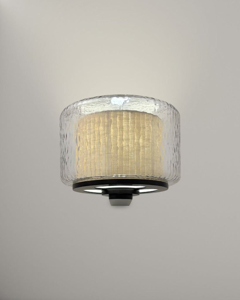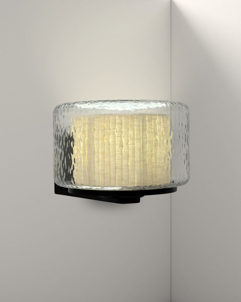 Lazur wall lamp combines a rippled glass shade with a warm, textured fabric inner diffuser, creating a soft, subtle light and a layered visual effect. Mounted on a sleek matte black frame, it adds a refined, sculptural presence to any space—perfect for hallways, bed side, or living areas.