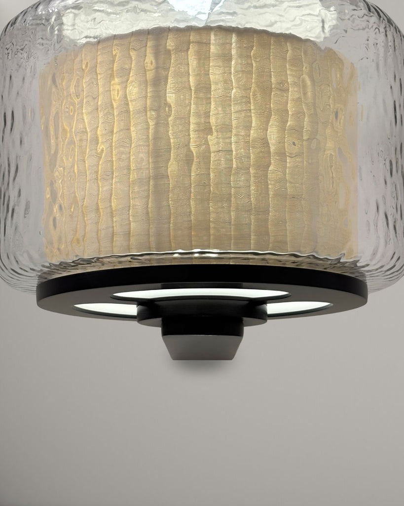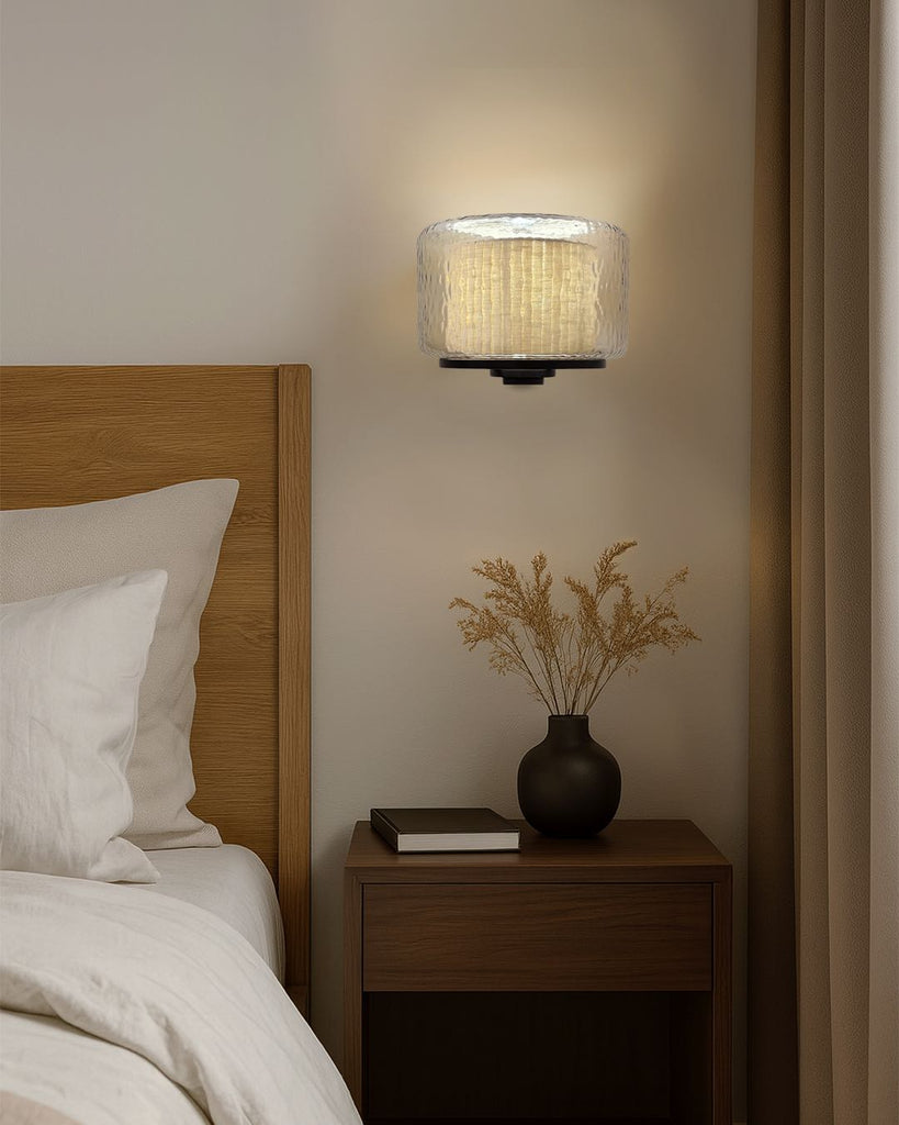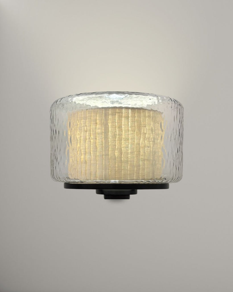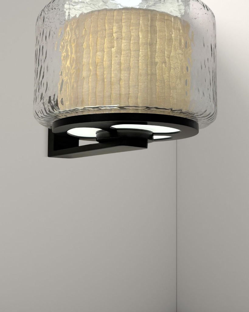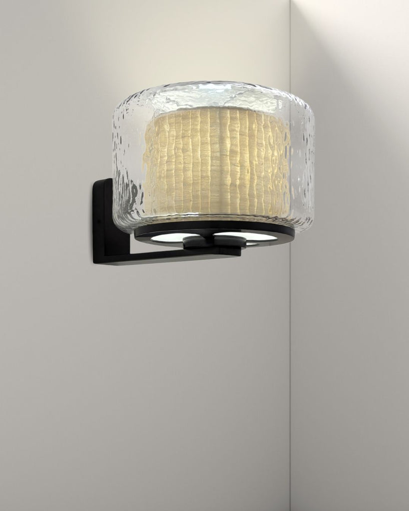 Lazur wall lamp combines a rippled glass shade with a warm, textured fabric inner diffuser, creating a soft, subtle light and a layered visual effect. Mounted on a sleek matte black frame, it adds a refined, sculptural presence to any space—perfect for hallways, bed side, or living areas.