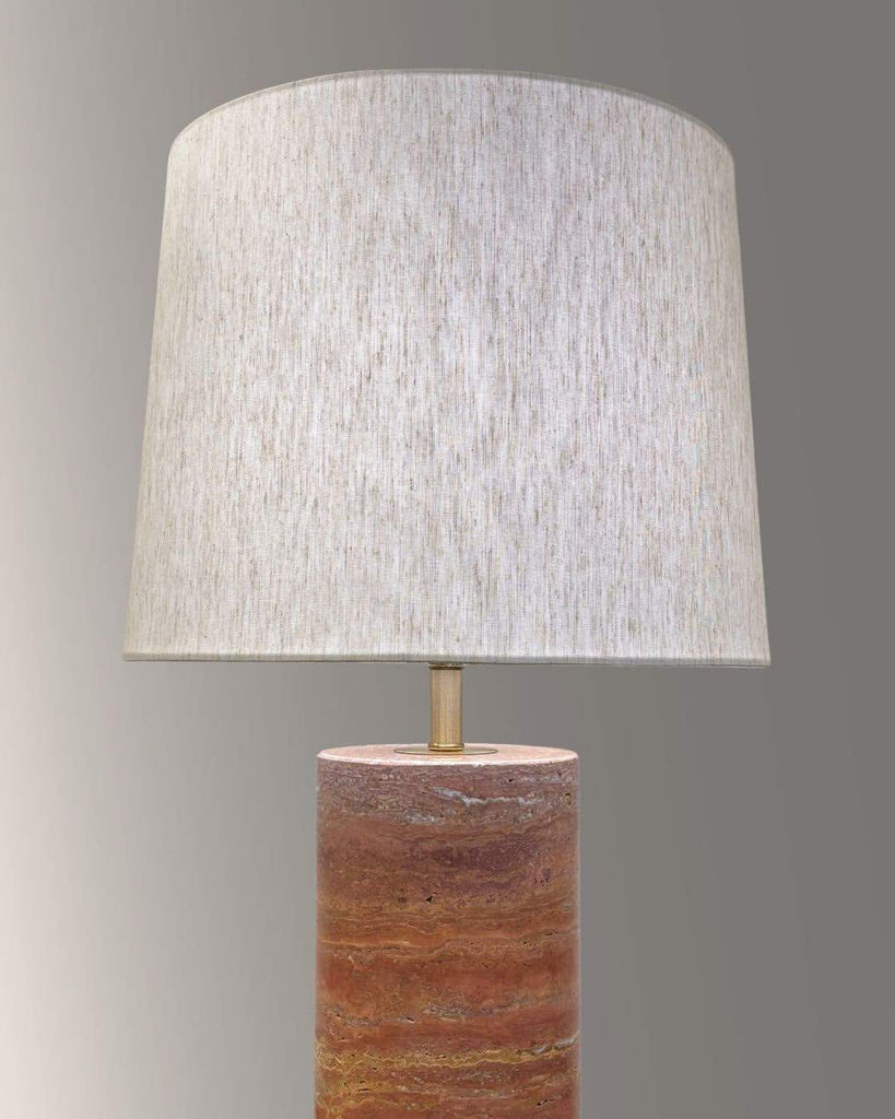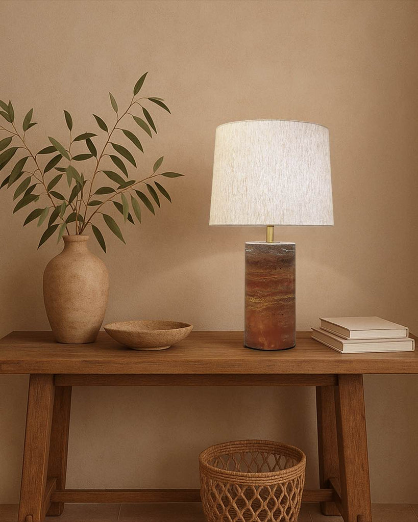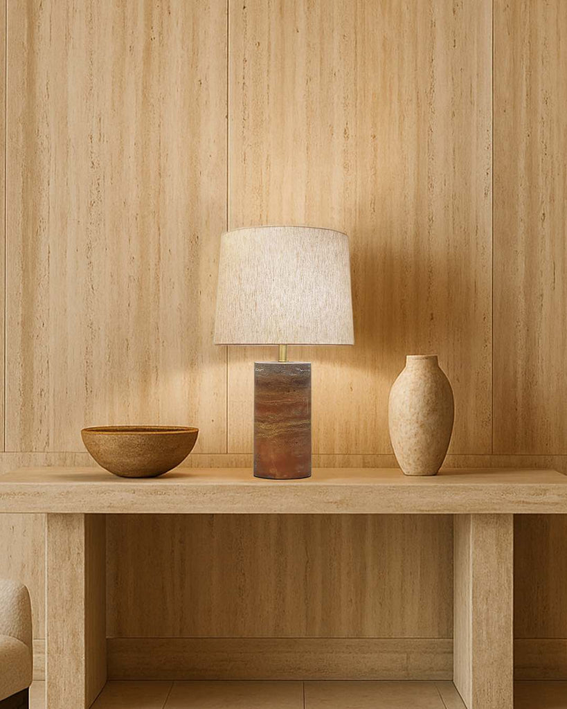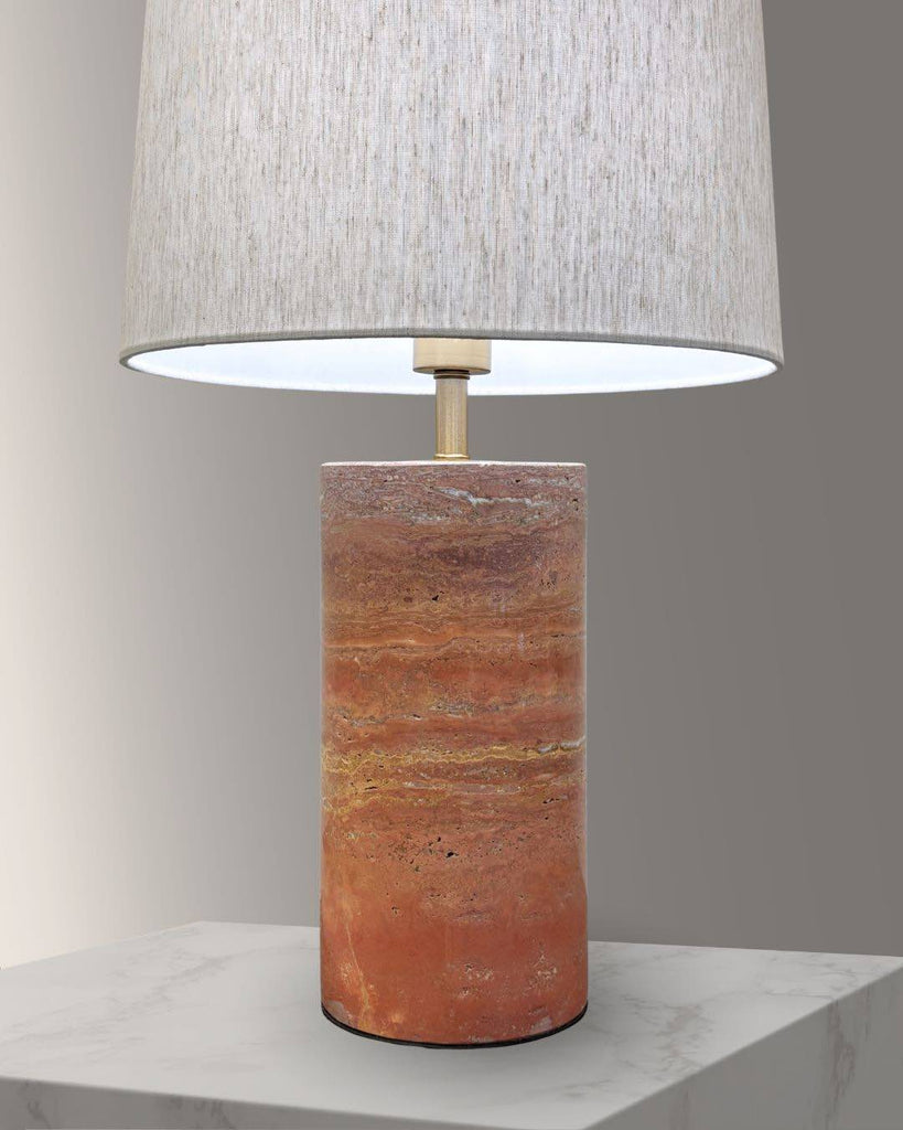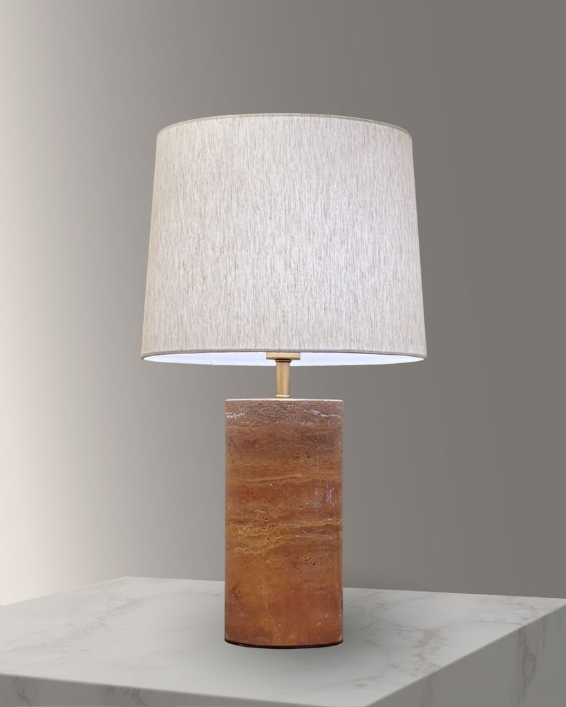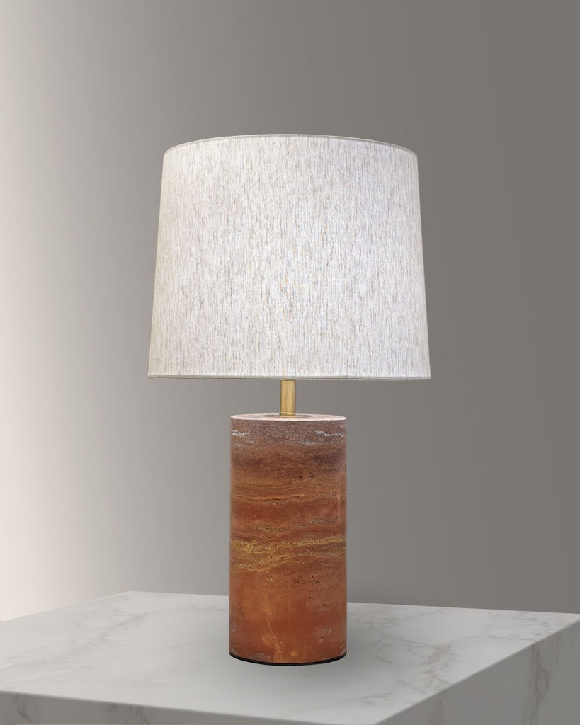 Featuring a solid travertine stone base in warm, earthy tones, each piece showcases unique natural veining that makes every lamp one-of-a-kind. The cylindrical form is paired with a soft fabric shade that diffuses light beautifully, creating a warm and inviting ambiance. Balanced with subtle brass detailing, this lamp blends timeless craftsmanship with modern design. Perfect for bedside tables, living room consoles, or office desks, the Luan elevates everyday lighting into a statement of refined style.