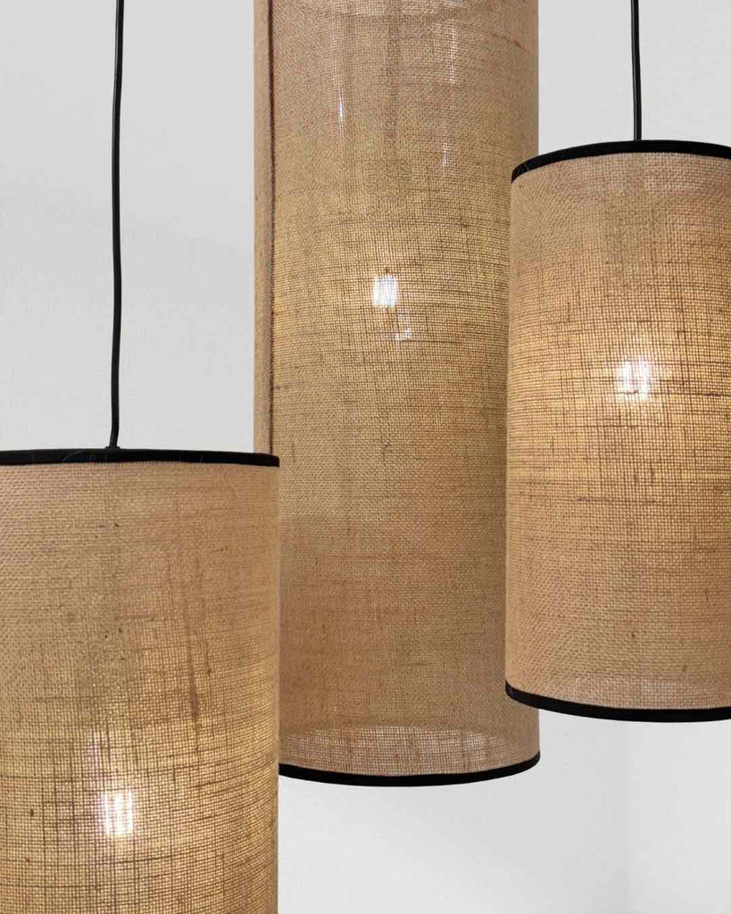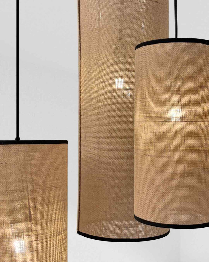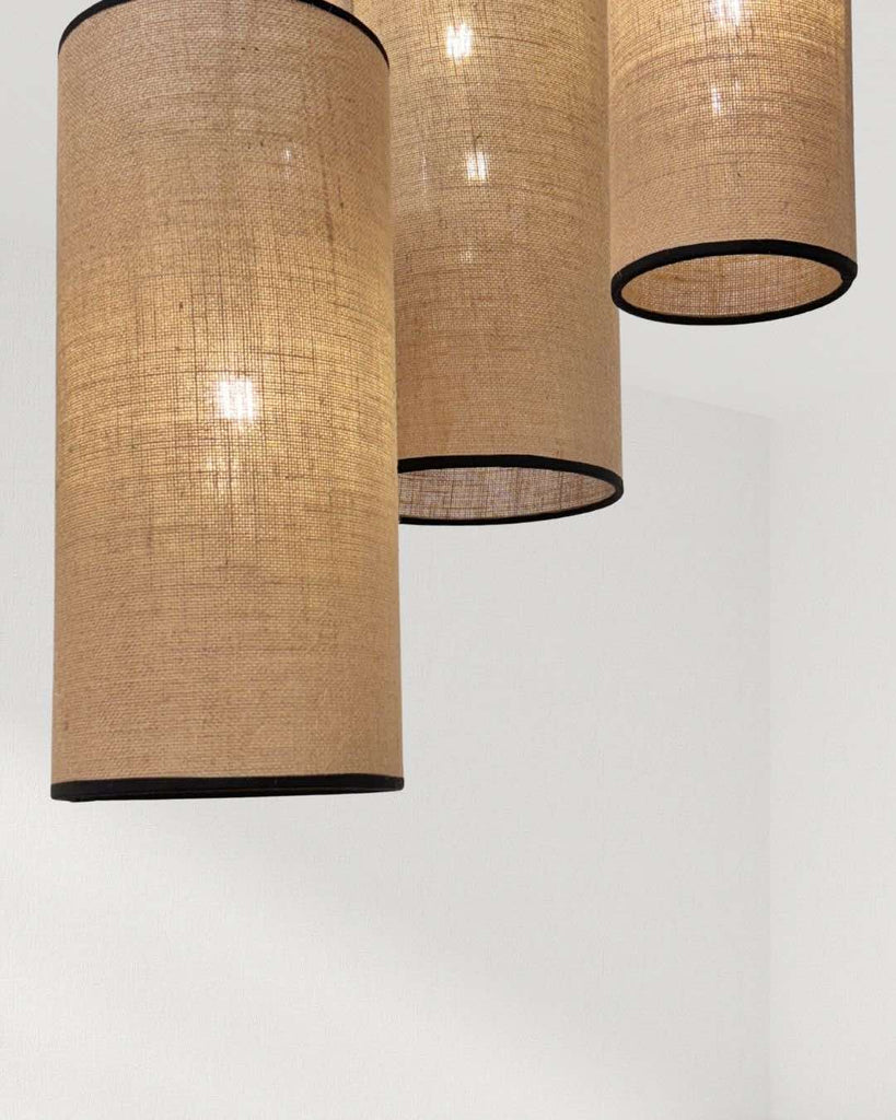 The Raya pendant blends organic texture with modern form. Crafted from natural burlap fabric, its cylindrical shade allows a warm, diffused light to filter through the woven fibers, creating a cozy, inviting glow. Finished with sleek black edging and suspended from a minimalist cord, this design adds an earthy elegance to dining areas, lounges, or creative spaces.