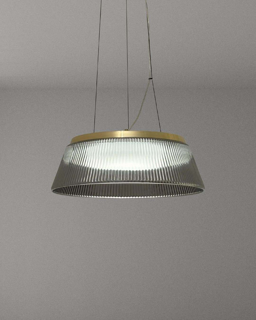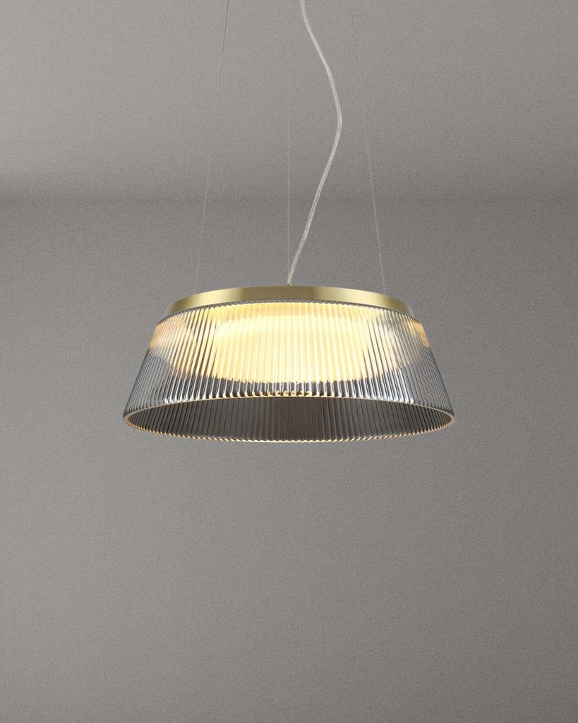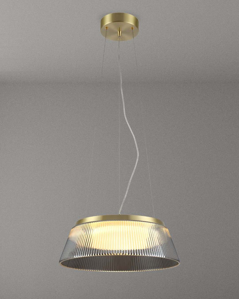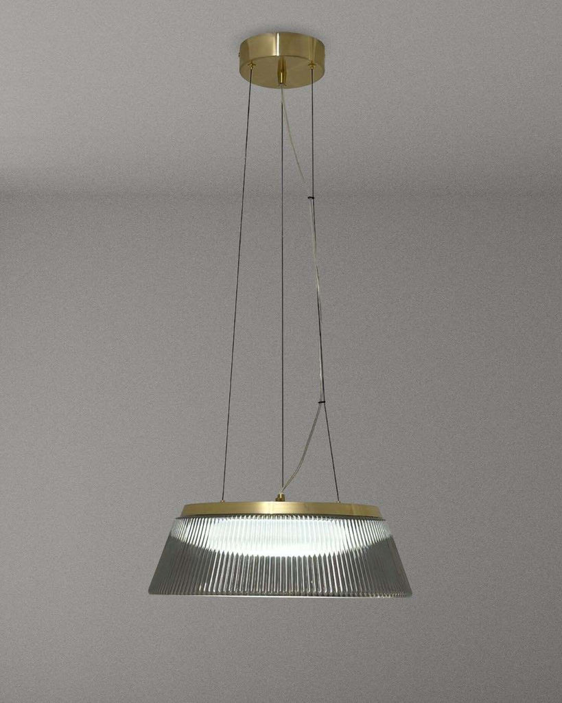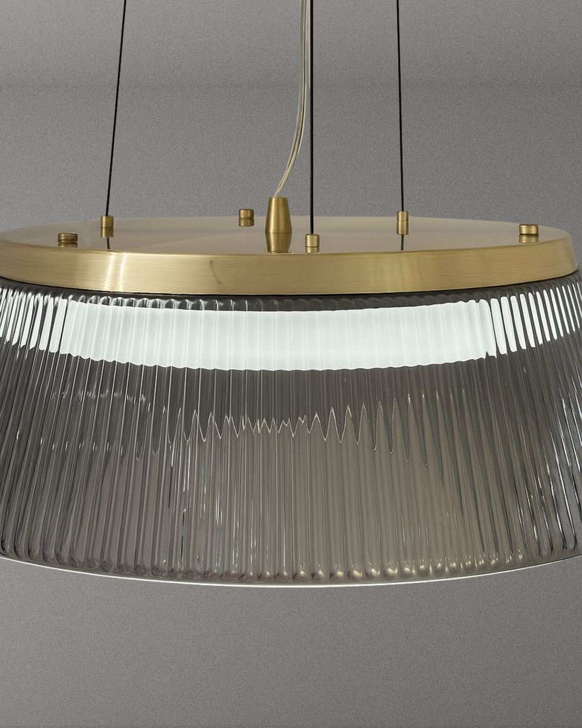 The Winslow 45 LED Pendant Lamp exudes modern elegance and timeless luxury. Its smoked glass shade and brass accents emit a warm radiance, while the ribbed design diffuses light for a refined ambiance. Ideal for dining areas, kitchen islands, or contemporary spaces, the adjustable suspension ensures the perfect fit.