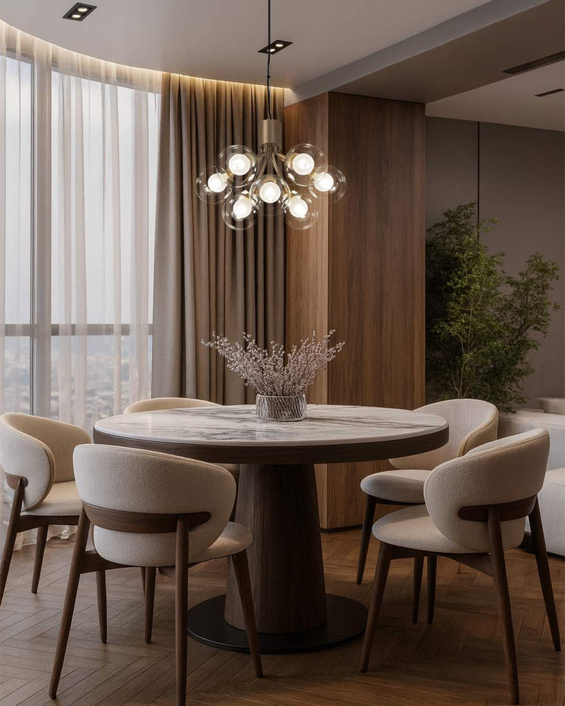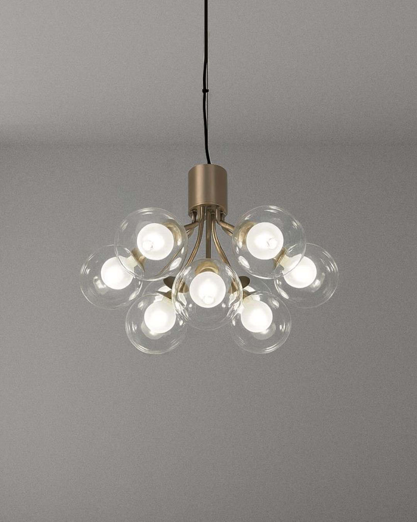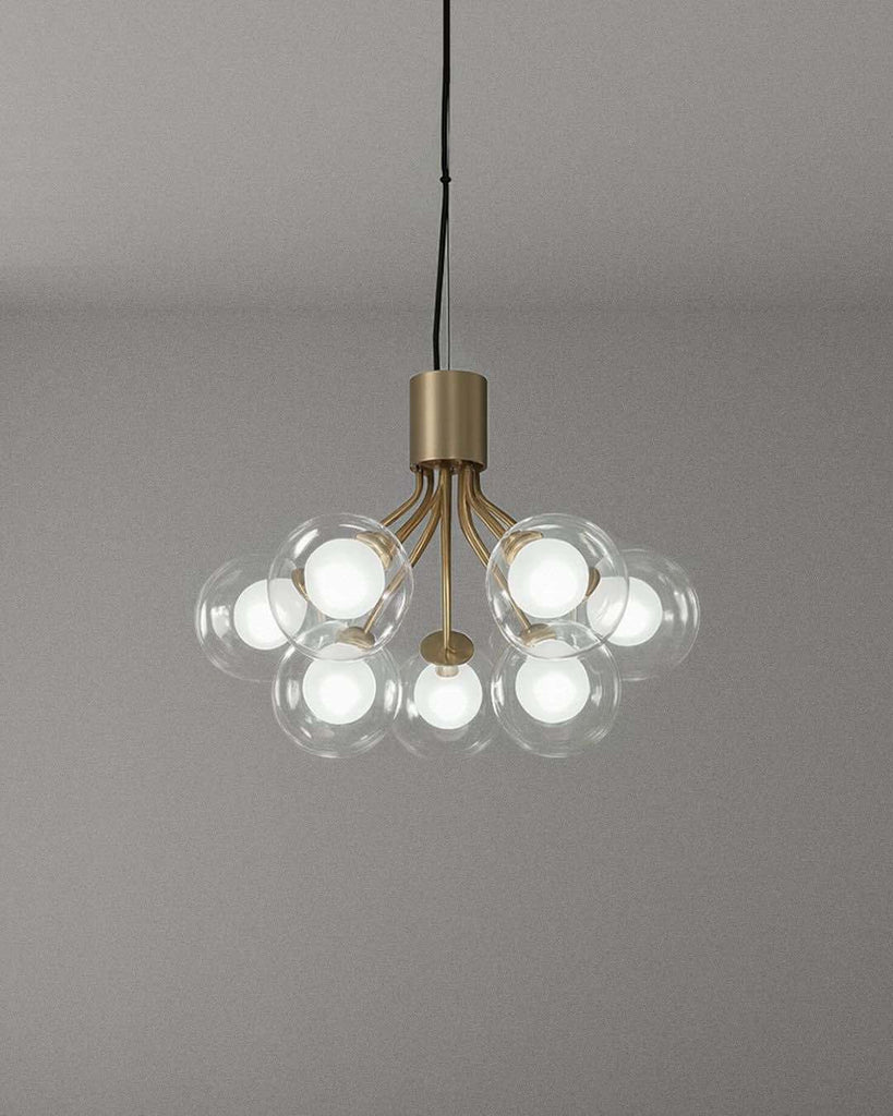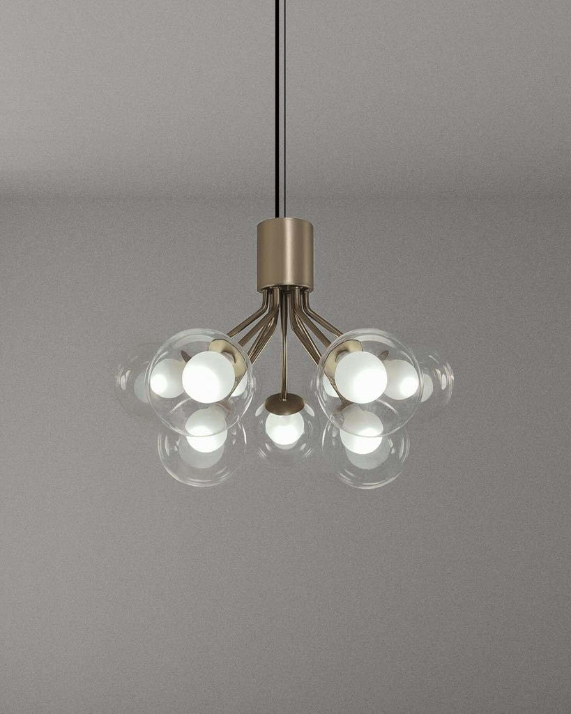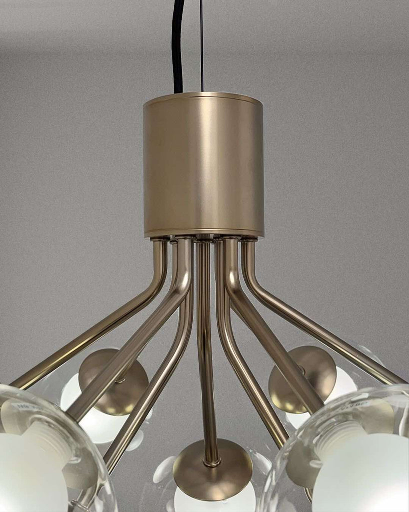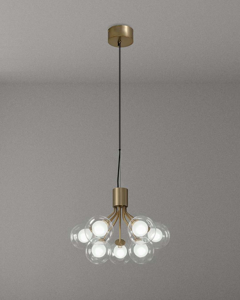 The Nulu suspension lamp showcases a refined cluster of clear glass globes arranged around gracefully arched metal arms in a brass finish, creating a luminous focal point that blends sculptural elegance with functional clarity. Its elongated drop and balanced composition offer sophisticated illumination ideal for dining areas, living spaces, and contemporary interiors seeking a statement piece. Meticulously crafted with attention to proportion and detail, Nulu delivers modern luxury through its harmonious interplay of light, transparency, and polished architectural form.