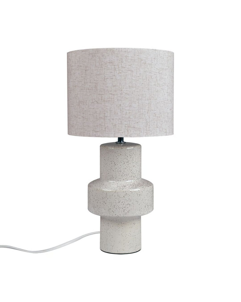 Dugan is a classic table lamp with a modern twist. The base is made of shiny ceramic in an intriguing shape, while the classic fabric shade ensures a warm, diffused light.
