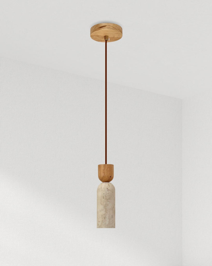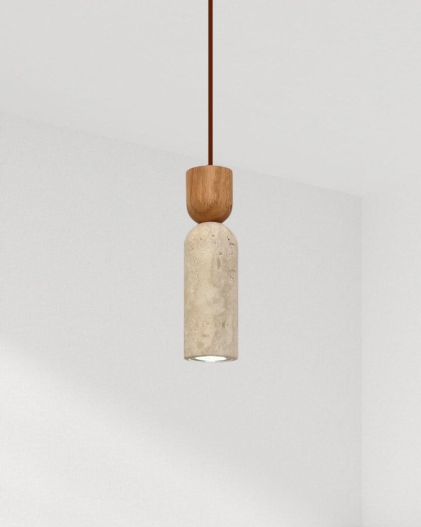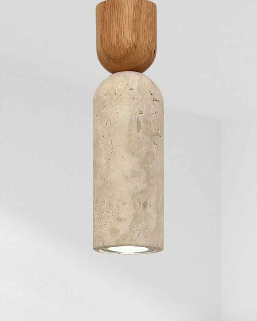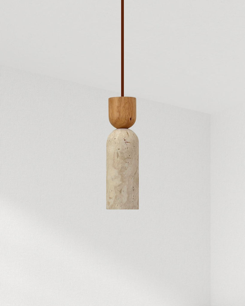 The Selis pendant lamp embodies a refined harmony between travertine stone and solid wood, showcasing a sleek cylindrical silhouette softened by organic textures. Its minimalist form highlights the natural beauty of each material—smooth wood meeting porous stone—for a design that feels warm yet sculptural. Perfect as a single accent or in pairs above kitchen islands, dining areas, or bedside spaces, Selis adds a touch of understated elegance and natural sophistication to any interior.
