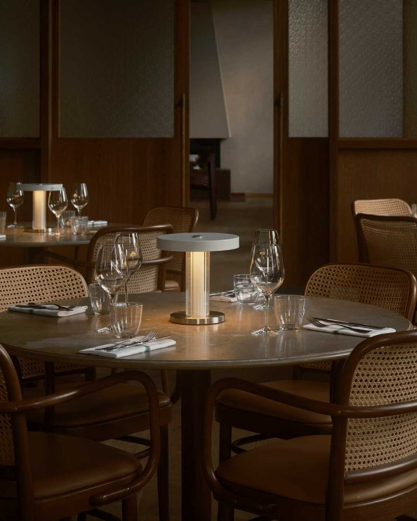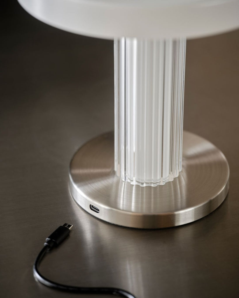 Trezzi, an elegant, portable table lamp was designed by Danish designer Anker Studio. Trezzi has a modern and elegant design with fluted glass that draws inspiration from Art Deco style. Dim the light in three steps using the touch button to create the perfect ambience. The lamp is easily charged with the included USB cable.