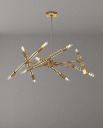 Crafted in natural brass, the Eclat Chandelier brings a striking balance of elegance and modernity to any interior. Its sleek tubular arms radiate from a central hub, each capped with exposed bulbs that emit a warm, inviting glow. The natural brass finish highlights its artisanal character, lending both durability and timeless sophistication. Ideal for low ceilings, dining rooms, living spaces, or entryways, this chandelier transforms lighting into a bold design statement.