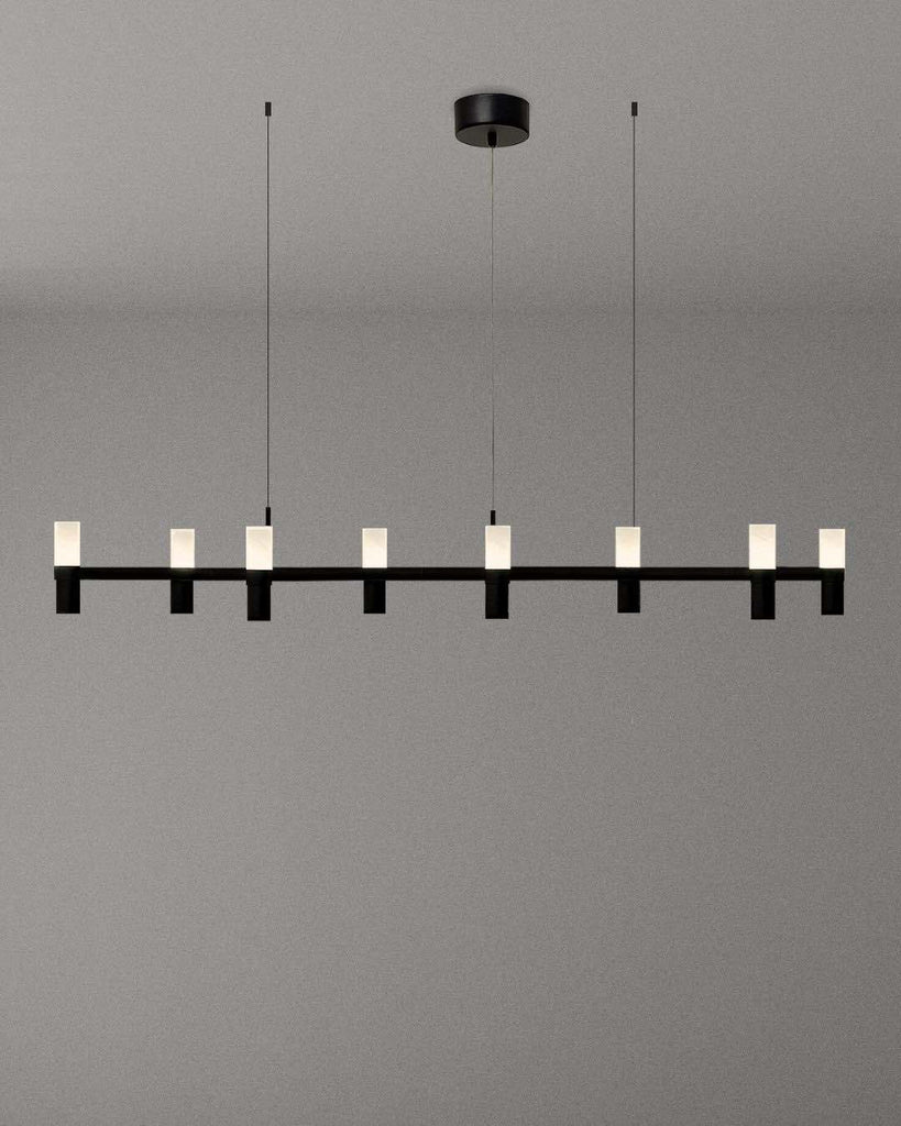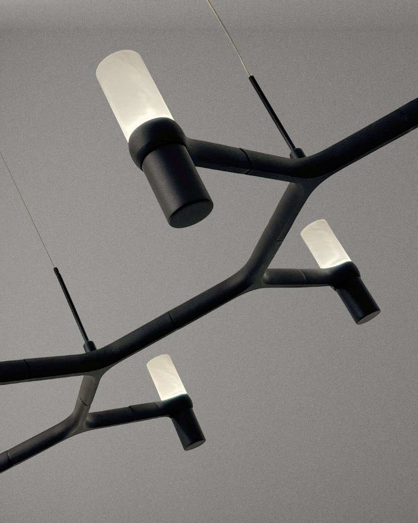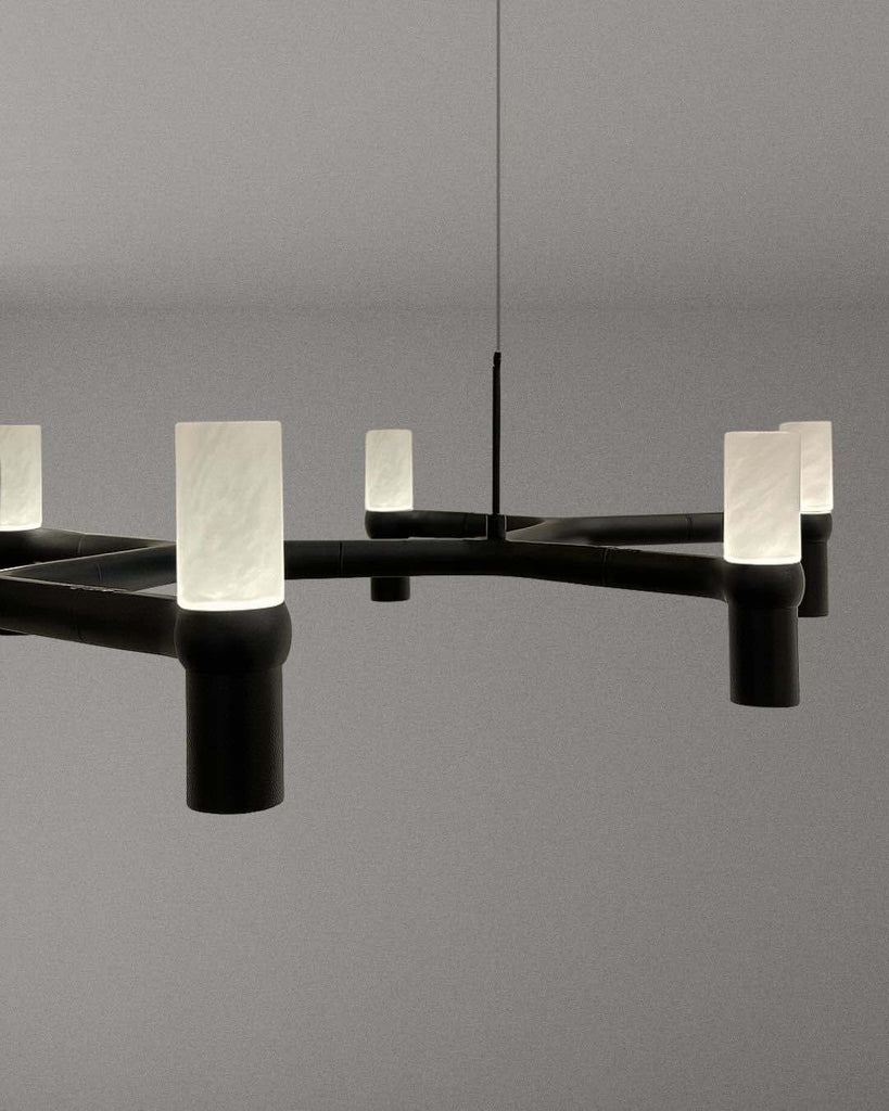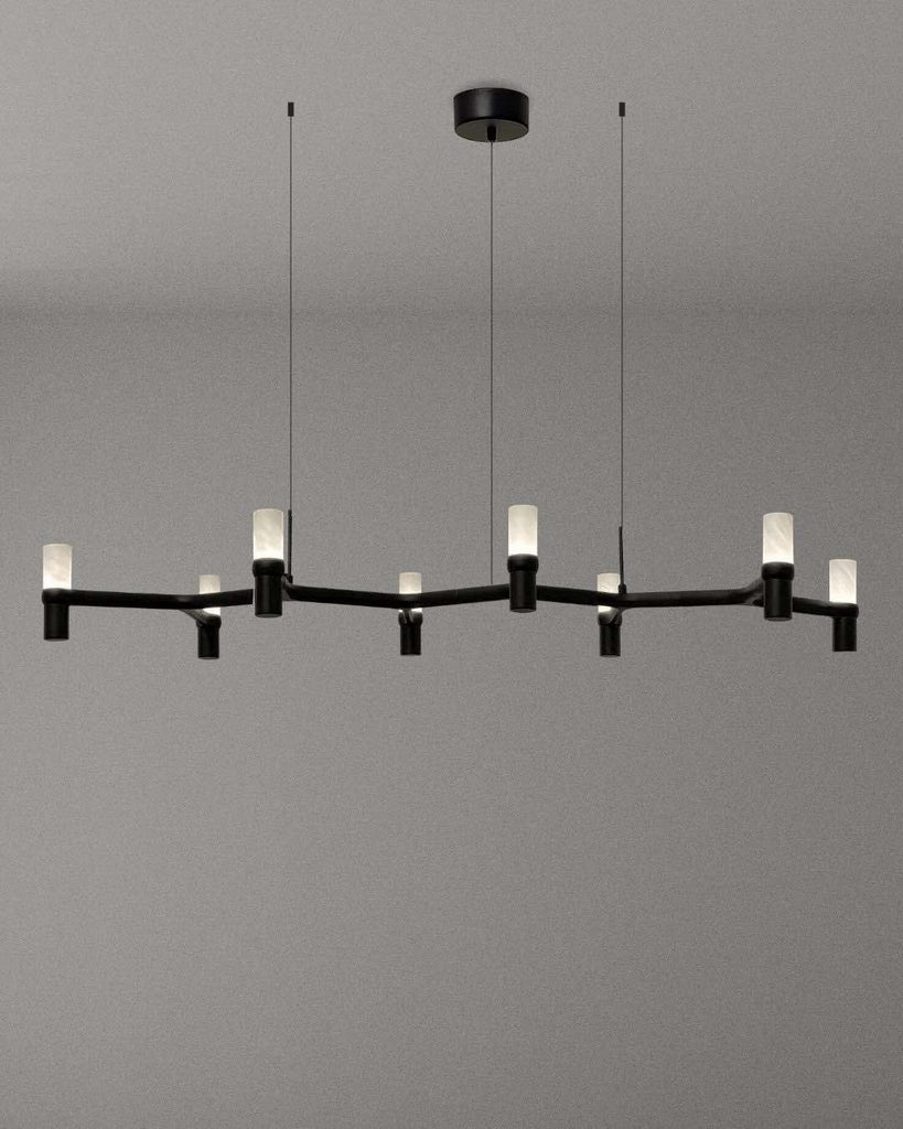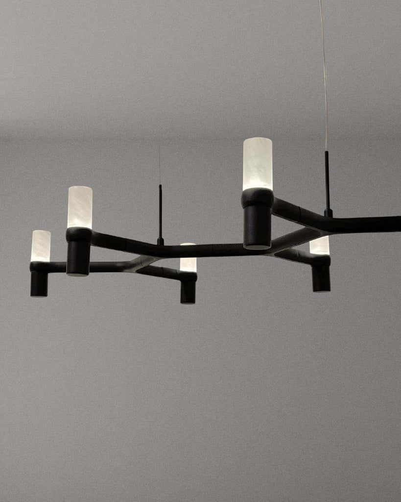 The Arqo Chandelier blends contemporary geometry with nature-inspired design, featuring a branch-like matte black frame that extends gracefully to support frosted cylindrical shades. These emit a gentle, diffused glow that fills the room with warmth while accentuating the fixture’s sculptural elegance. Ideal for dining rooms, living spaces, or open interiors, the Arqo offers a perfect balance of striking design and functional illumination.