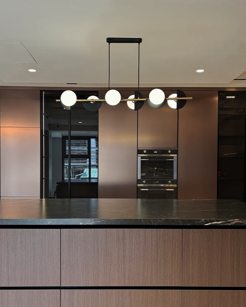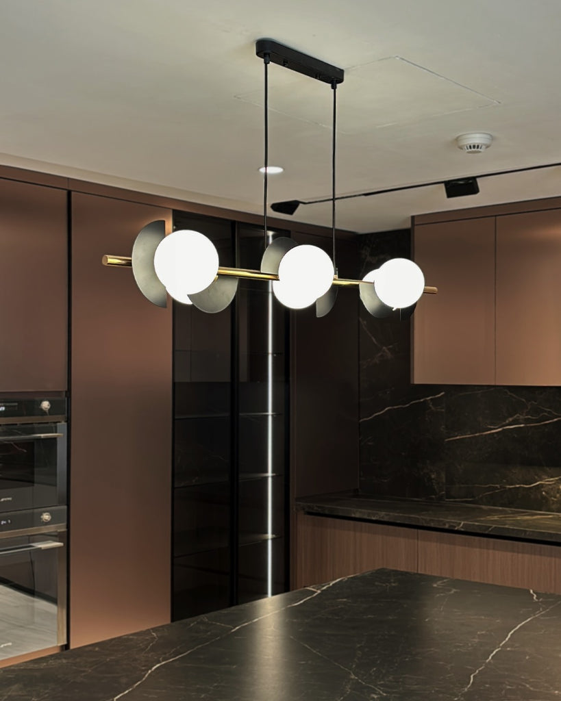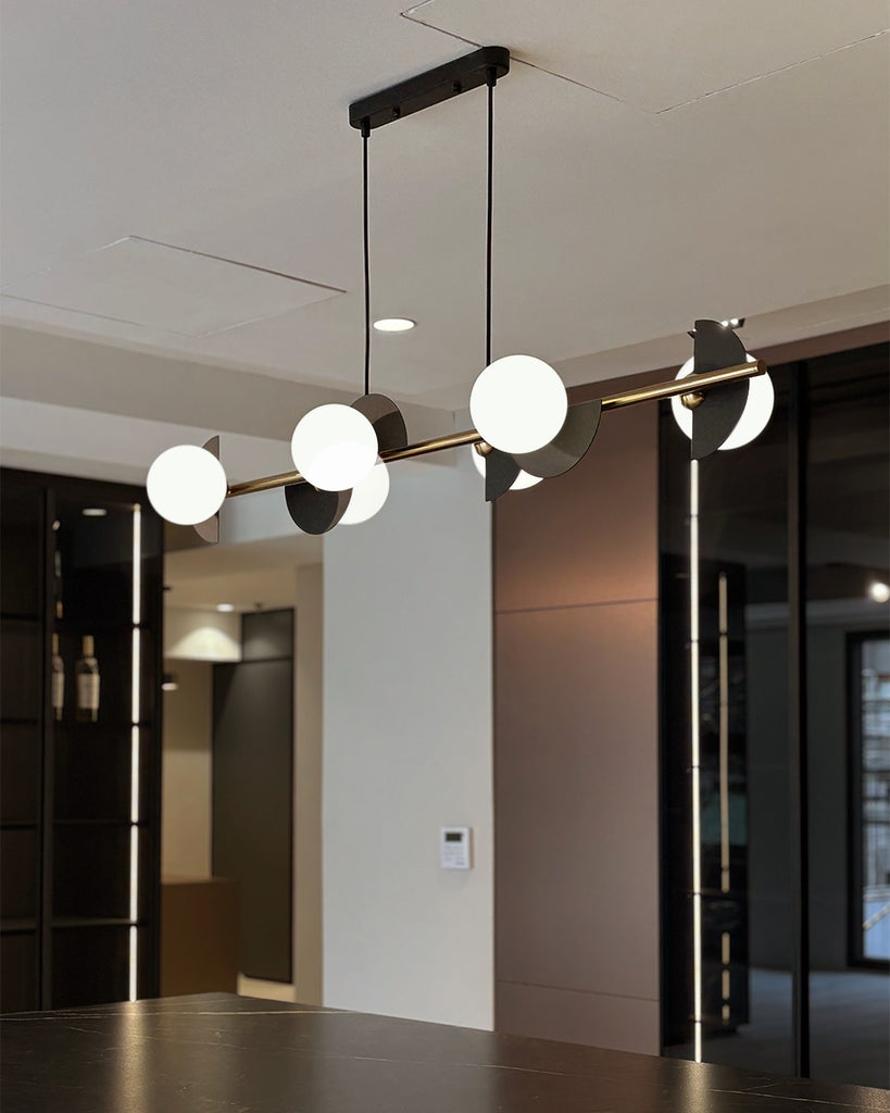 The Caelum suspension lamp takes inspiration from celestial orbits with its striking arrangement of spherical glass diffusers and sculptural half-disc shades. Suspended along a sleek brass-finished linear frame, each globe emits a warm, even glow, while the contrasting black accents create a dramatic rhythm of light and shadow. Perfect over dining tables, kitchen islands, or modern living spaces, this statement piece blends geometric precision with atmospheric illumination.