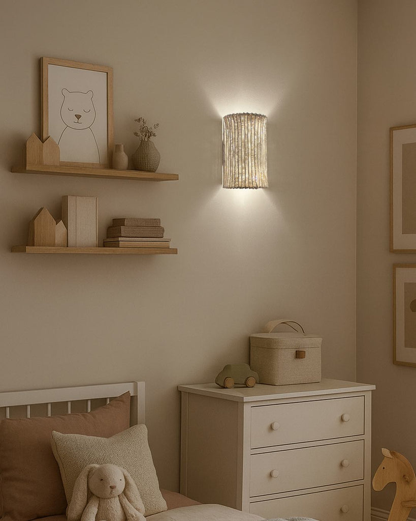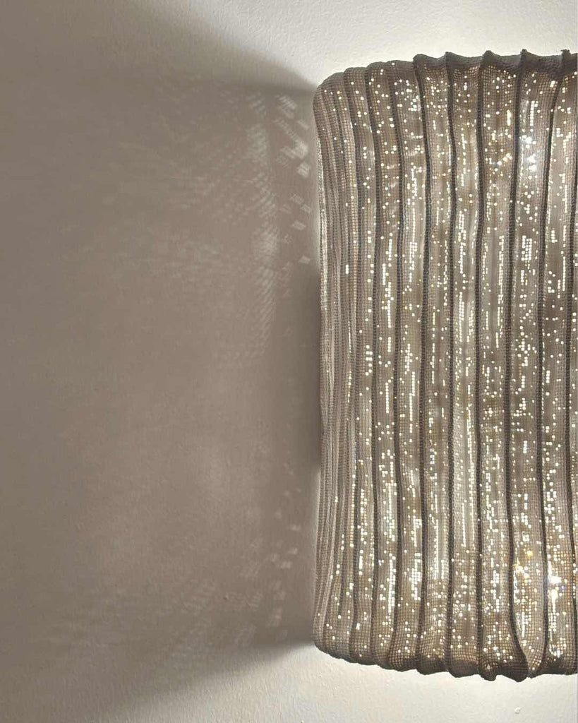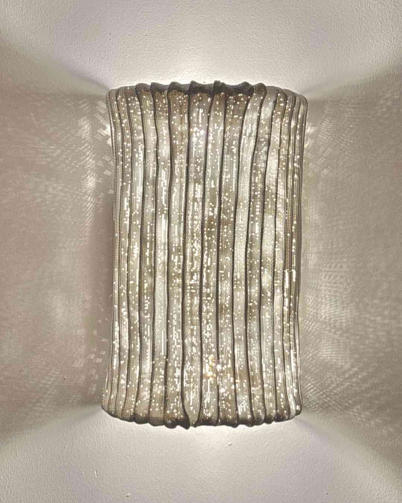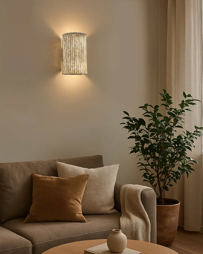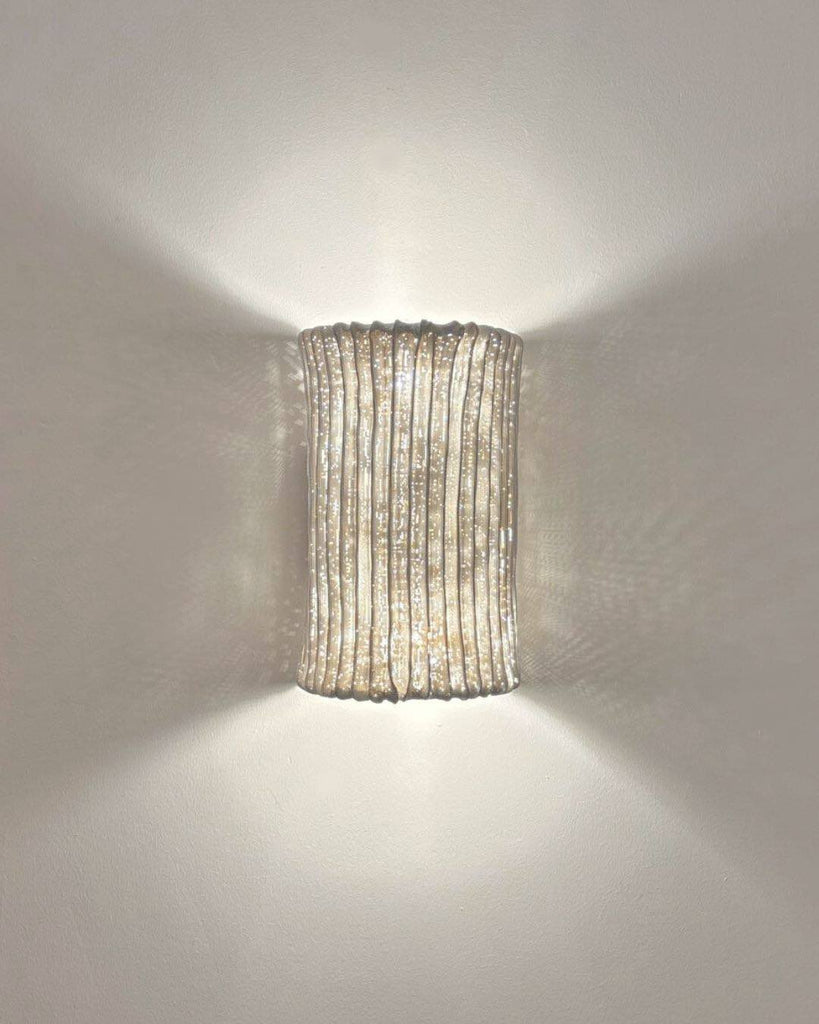 The Alco Wall Lamp pairs understated elegance with captivating texture. Its curved, ribbed shade shimmers with a soft, diffused glow, casting intricate light patterns on surrounding walls. Perfect for hallways, bedrooms, or living spaces, it blends artful design with ambient illumination—bringing warmth and sophistication to any interior.