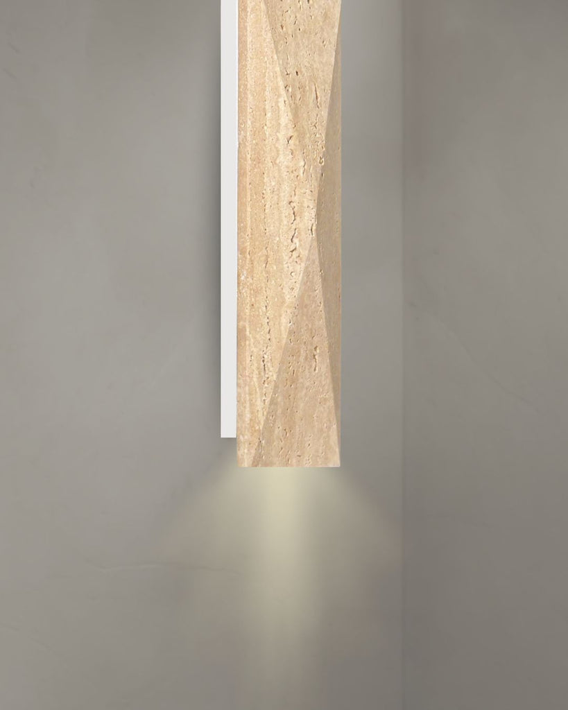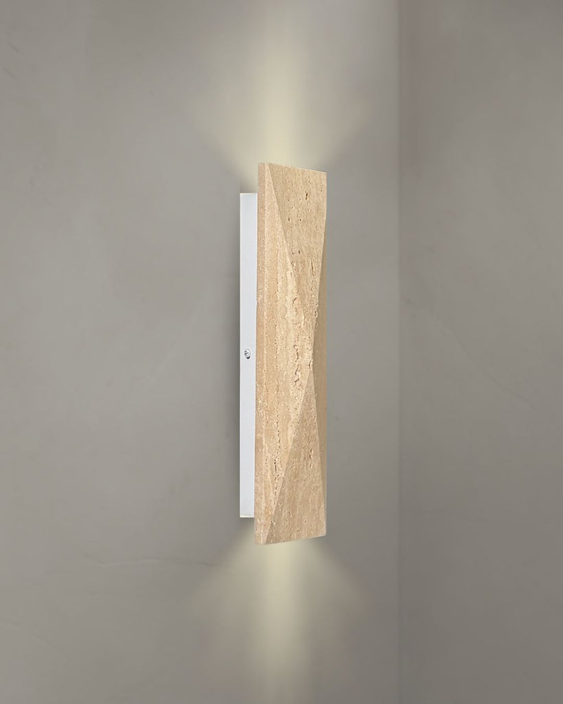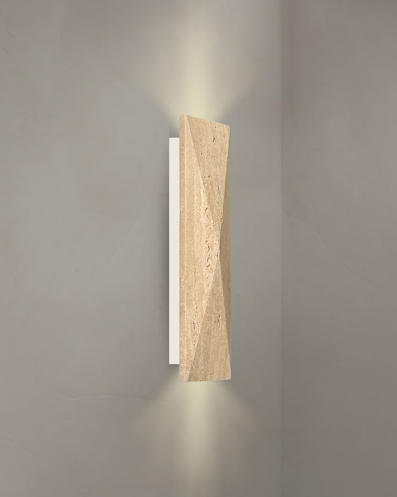 Devon is a sculpted Travertine wall lamp that highlights the raw beauty of natural stone through a refined geometric silhouette. Its clean, architectural form casts a gentle up-and-down glow, creating a warm and calming ambiance in any space. Minimalist yet striking, Devon brings organic elegance to hallways, bedrooms, living areas, and modern interiors seeking a timeless natural accent.