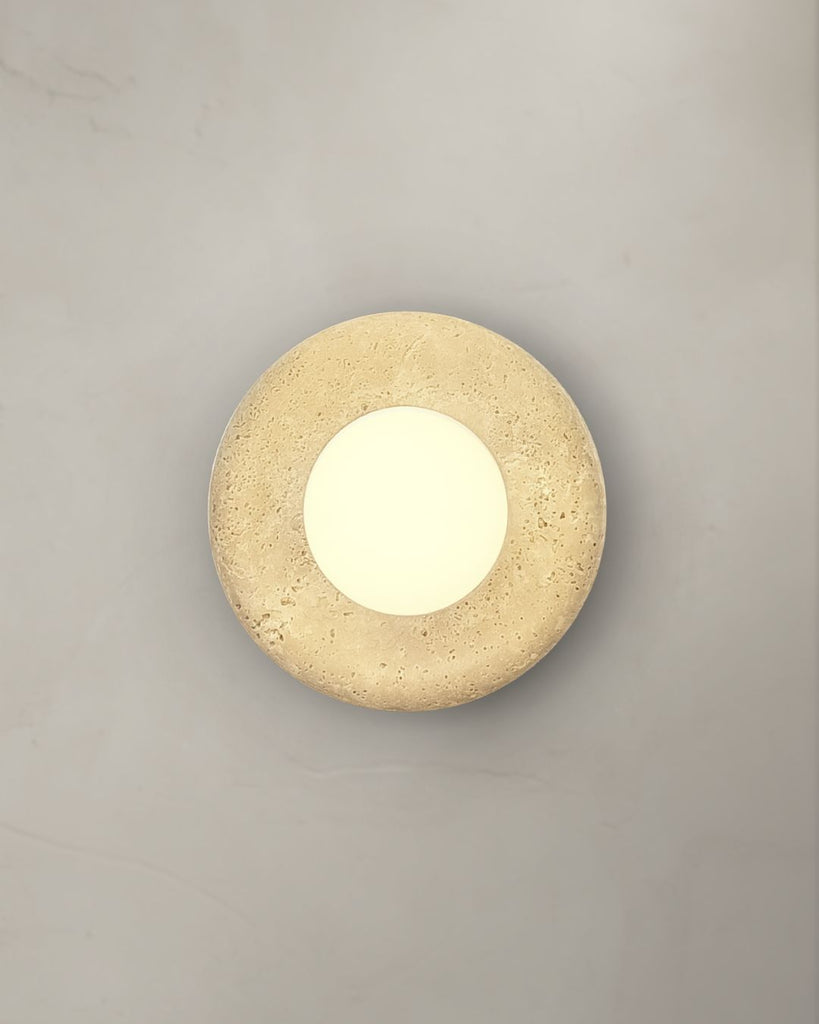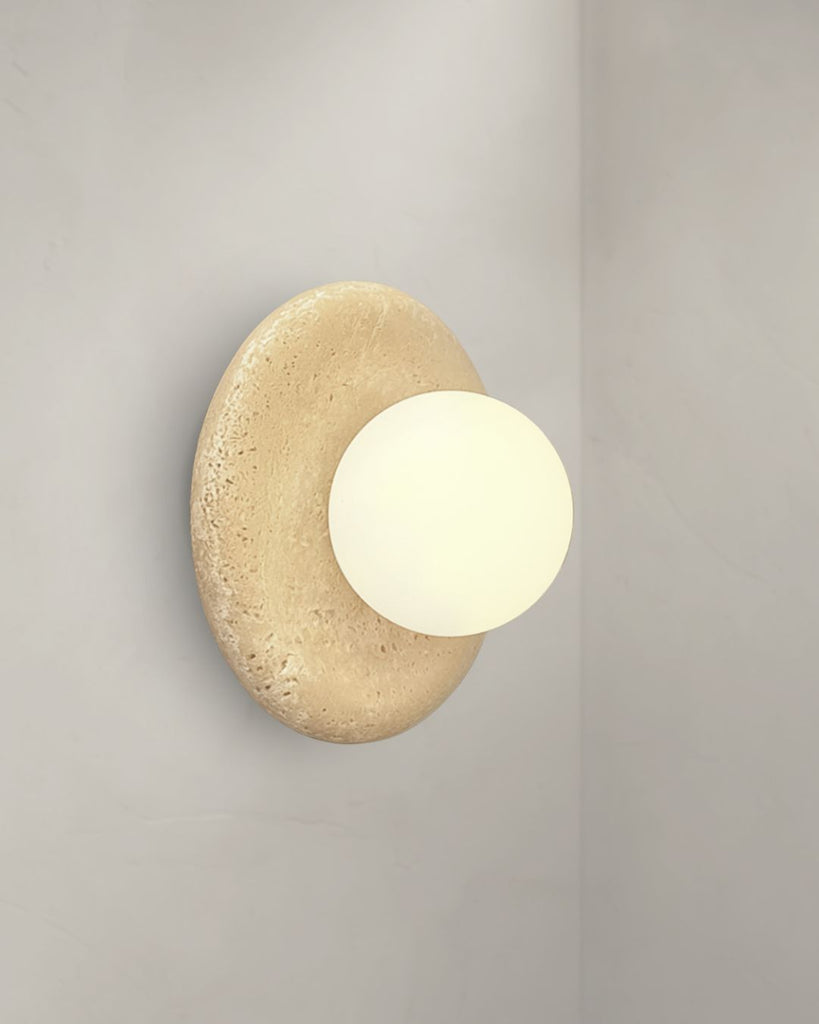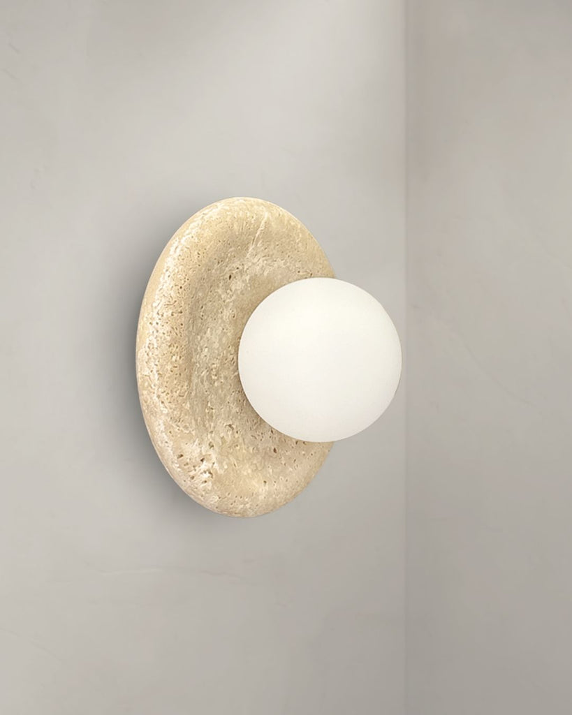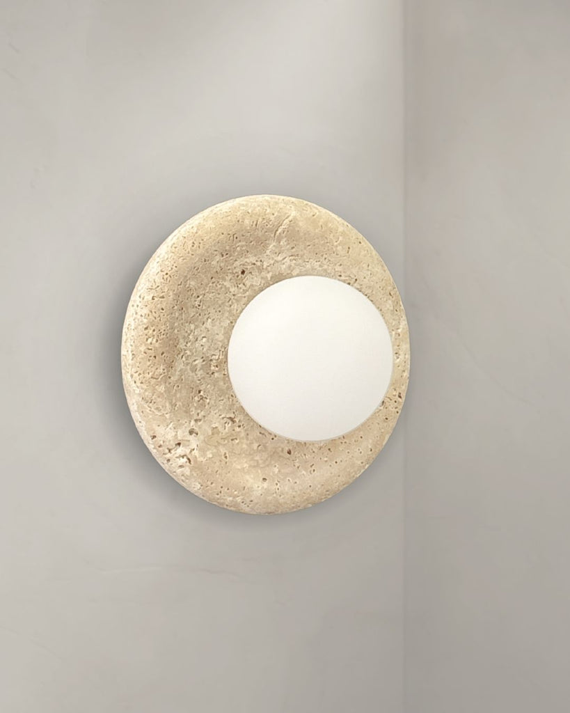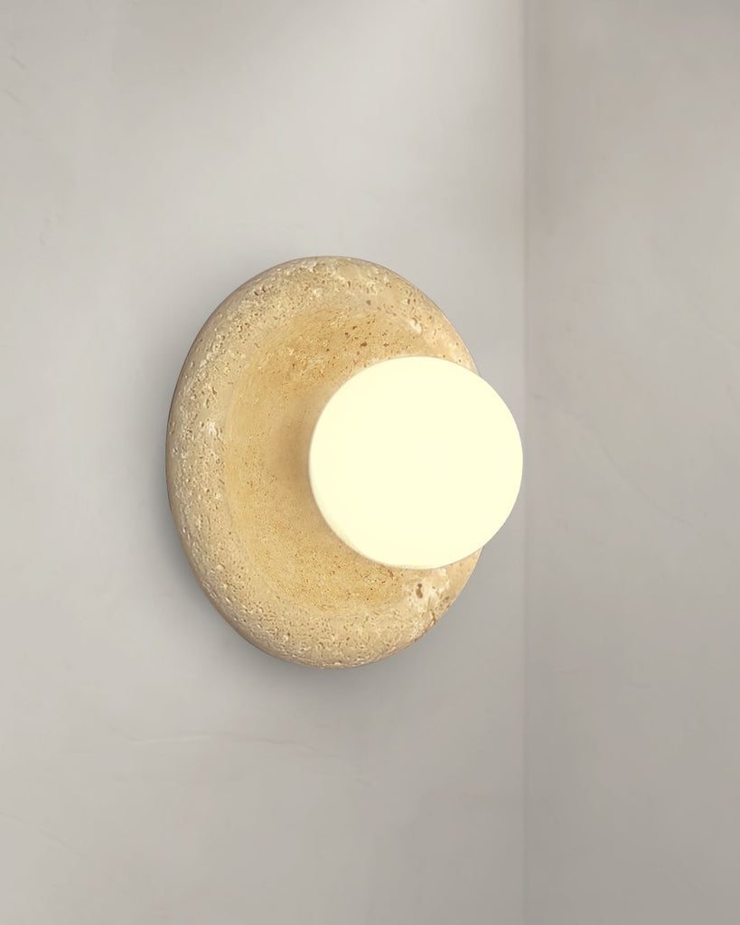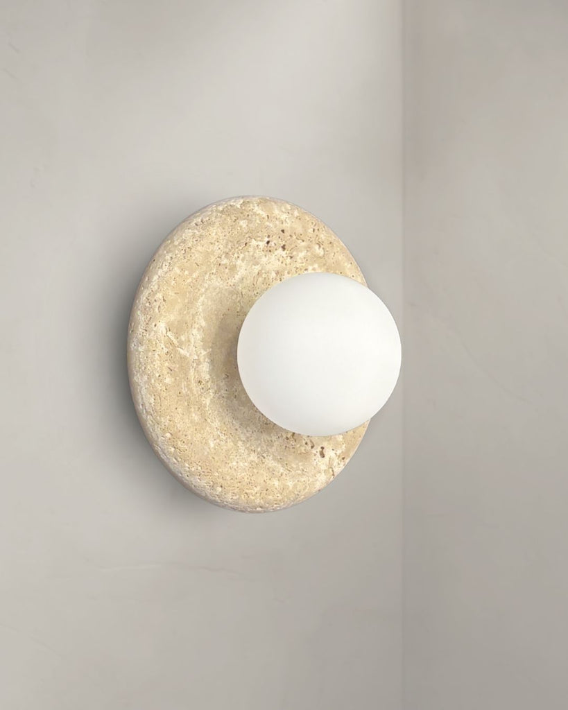 Gior wall lamp features a hand-crafted travertine base paired with a frosted glass globe that casts a gentle, diffused glow. The organic texture of the travertine brings warmth and character to any space, while the smooth frosted glass adds a modern, refined balance. Designed as both a functional light source and a statement piece, it elevates bedrooms, hallways, and living areas with effortless sophistication and timeless, earthy elegance.