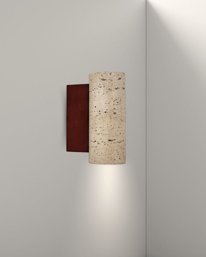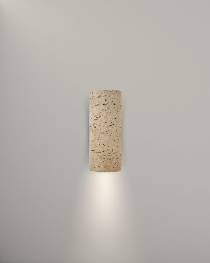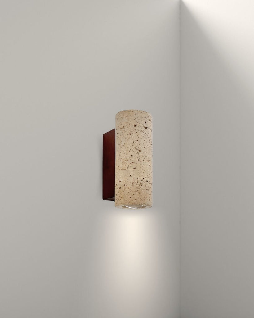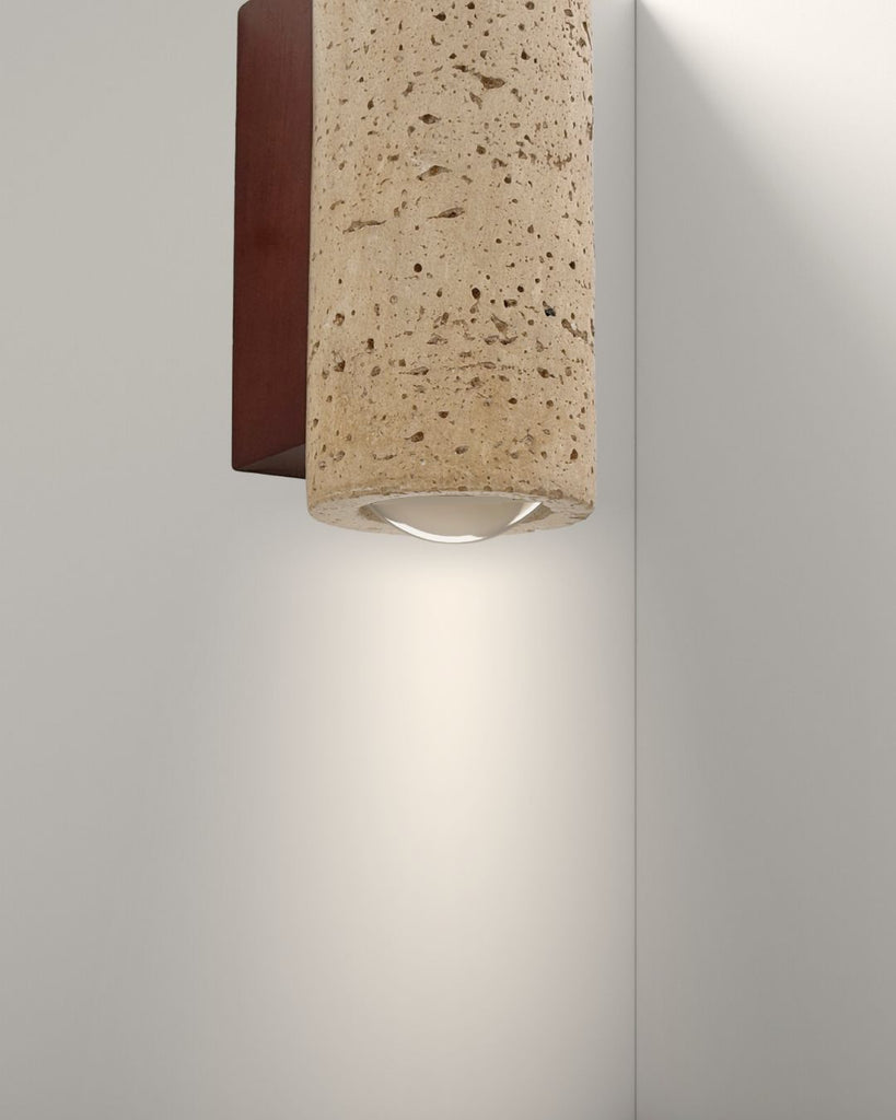 Crafted from natural Travertine stone and rich wood, the Pietra wall lamp exudes organic elegance. Its cylindrical form and raw texture highlight the timeless beauty of stone, while the warm wooden backplate adds depth and contrast. Emitting a soft, focused glow, Pietra is perfect for creating a serene ambiance in hallways, bedrooms, or living spaces.